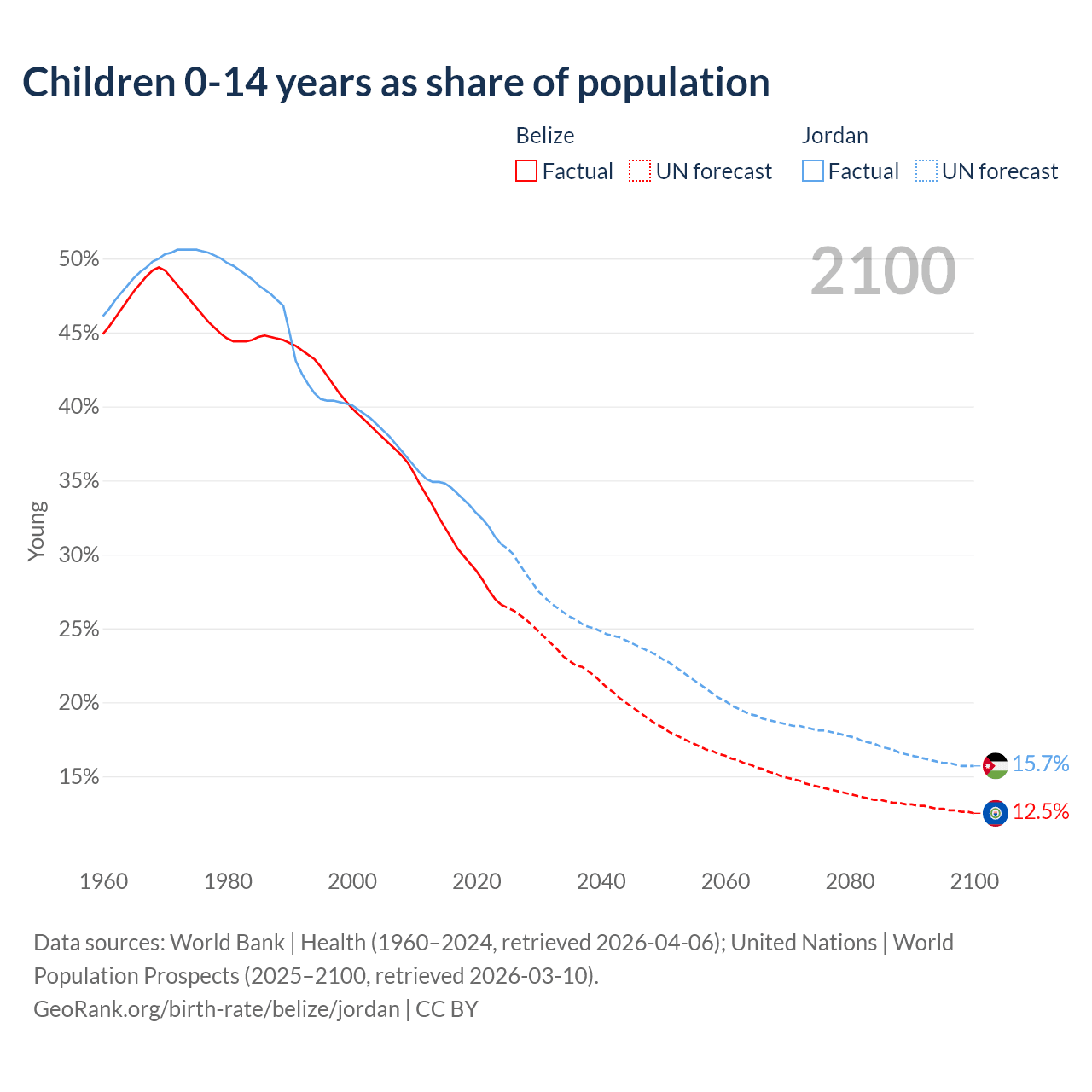 According to the latest available data on birth rates, the fertility rate in Belize was 2.01 children per woman in 2023, compared to 2.64 in Jordan in 2023. The replacement level is considered to be 2.1 children per woman.