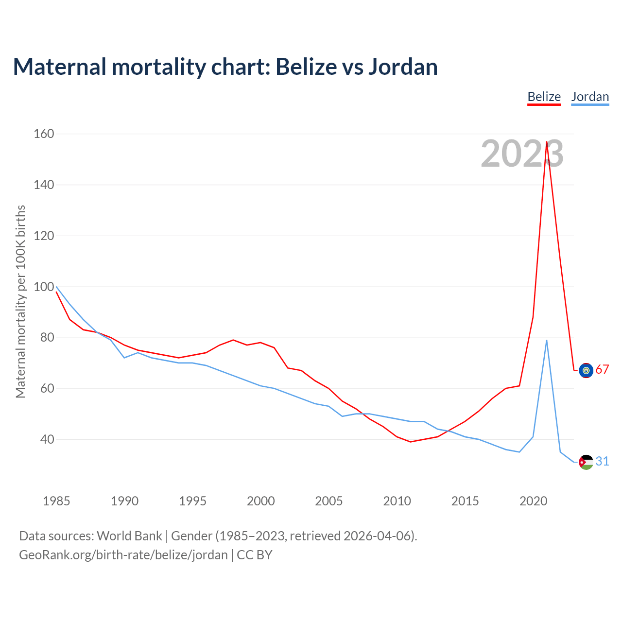 The maternal mortality rate, which is the probability of dying during childbirth or within 42 days of pregnancy termination, is 67 deaths per 100,000 live births in Belize, compared to 31 deaths in Jordan.
