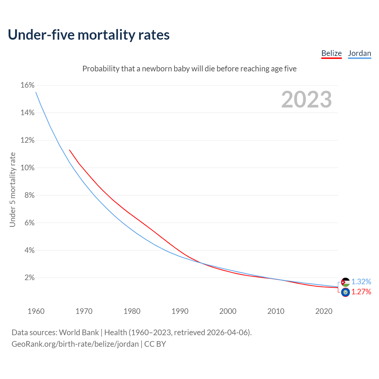 The chance that a newborn baby will die before reaching age five is 1.27% in Belize and 1.32% in Jordan. Above is a chart with historical data on under-five mortality rates.