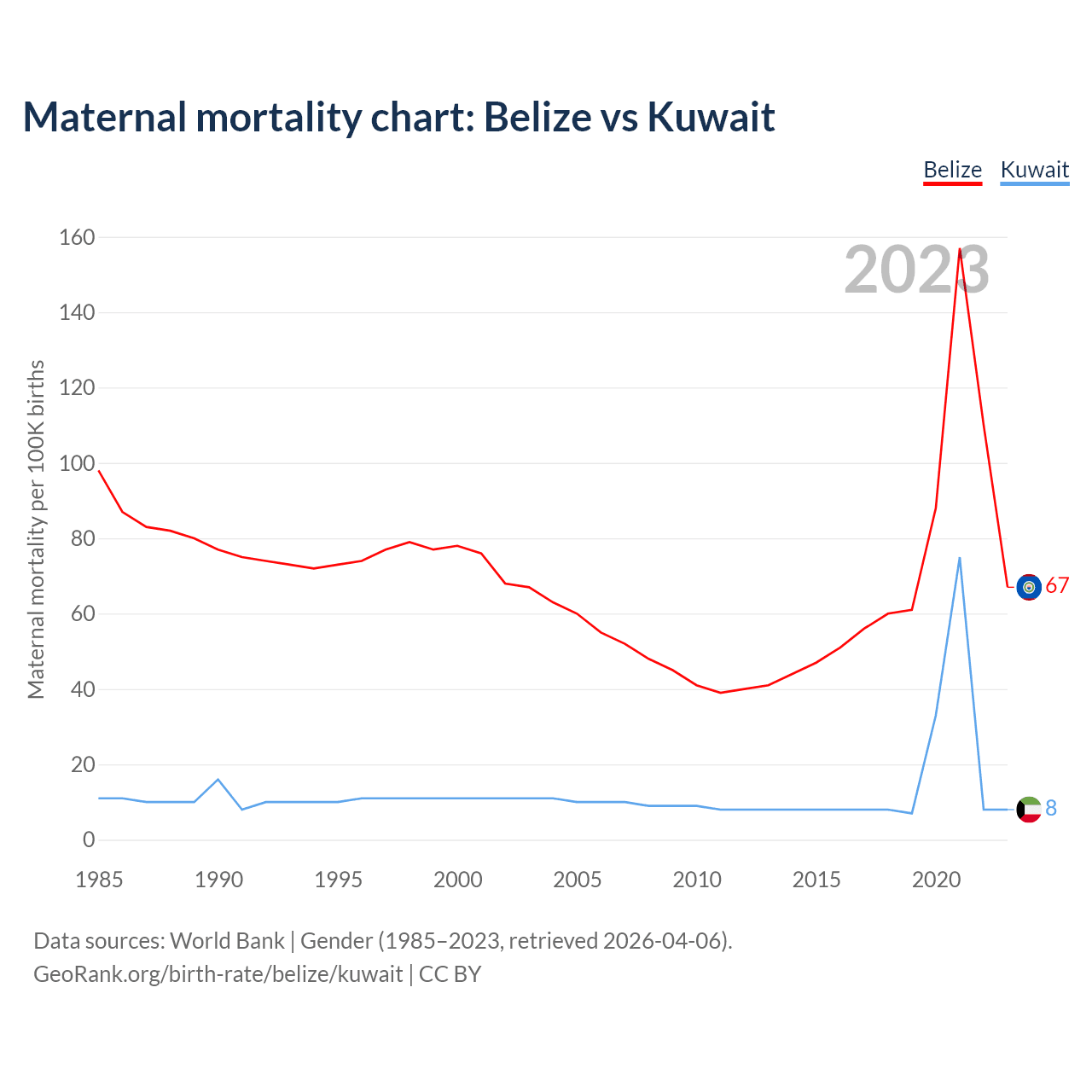 The maternal mortality rate, which is the probability of dying during childbirth or within 42 days of pregnancy termination, is 67 deaths per 100,000 live births in Belize, compared to 8 deaths in Kuwait.