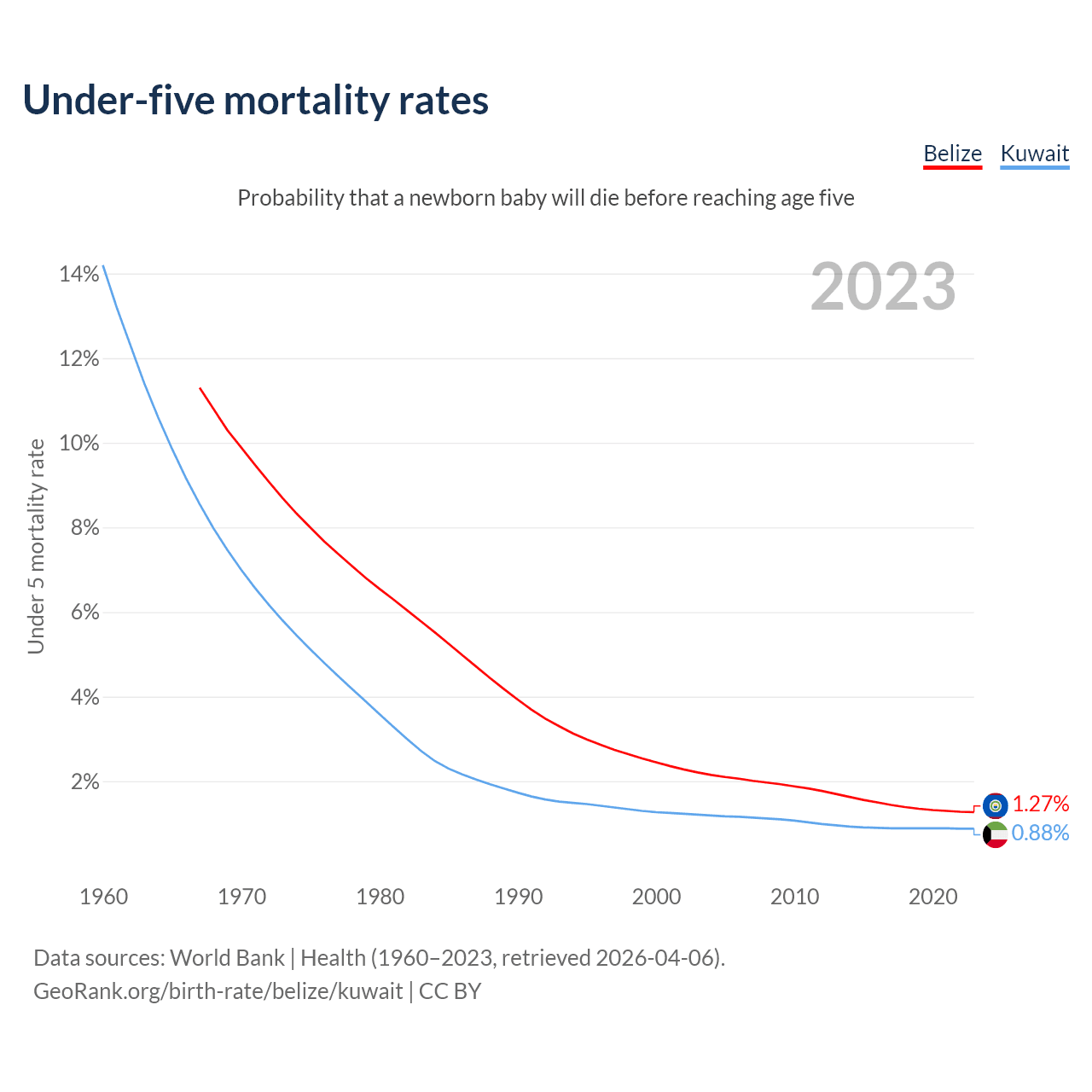 The chance that a newborn baby will die before reaching age five is 1.27% in Belize and 0.88% in Kuwait. Above is a chart with historical data on under-five mortality rates.