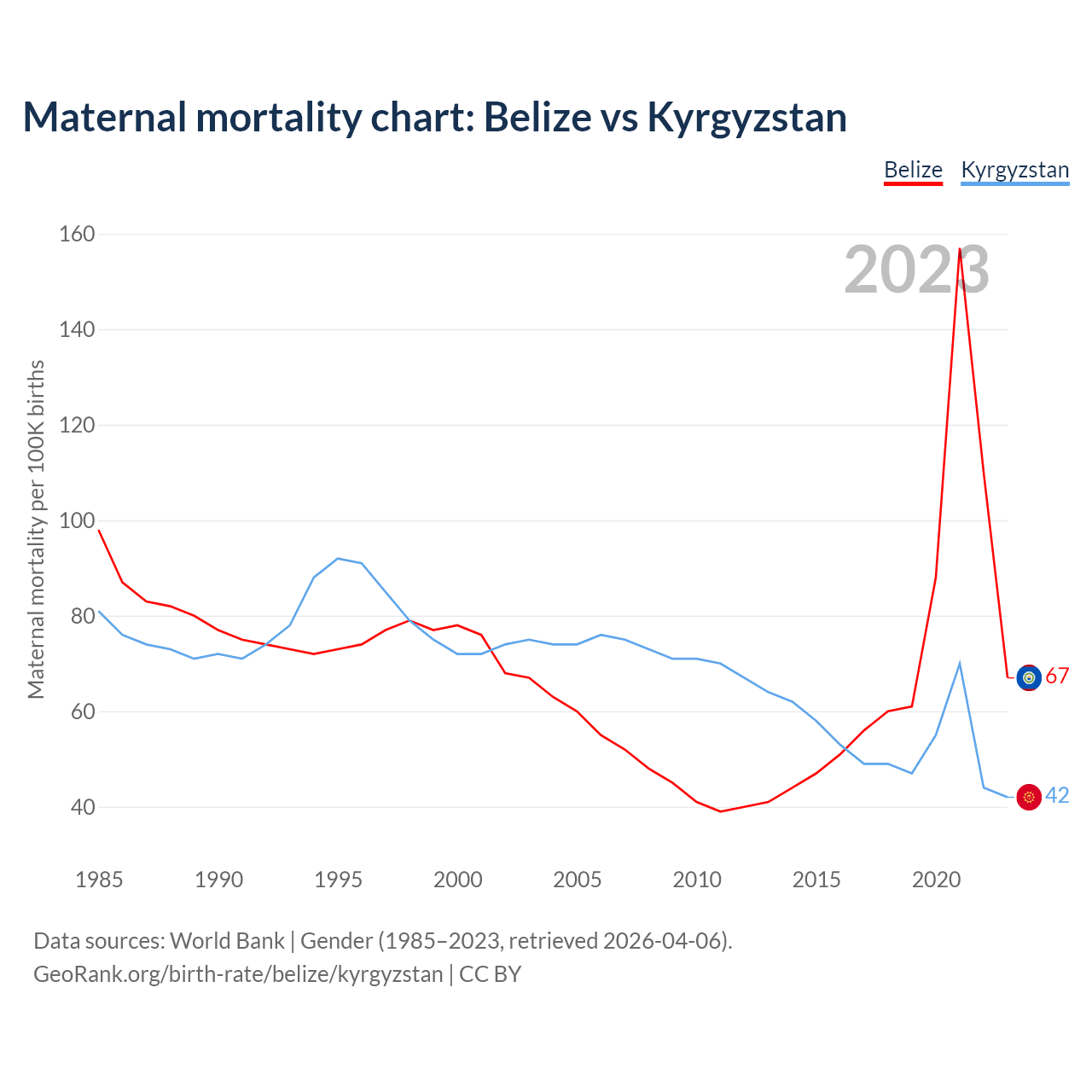 The maternal mortality rate, which is the probability of dying during childbirth or within 42 days of pregnancy termination, is 67 deaths per 100,000 live births in Belize, compared to 42 deaths in Kyrgyzstan.