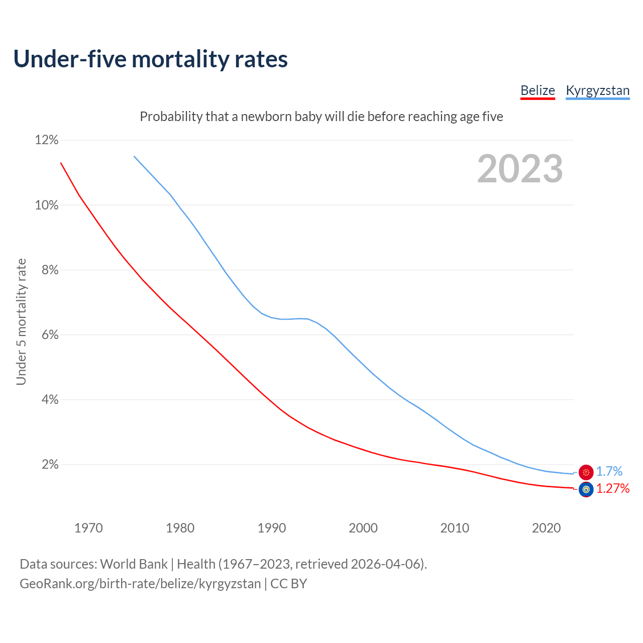 The chance that a newborn baby will die before reaching age five is 1.27% in Belize and 1.7% in Kyrgyzstan. Above is a chart with historical data on under-five mortality rates.