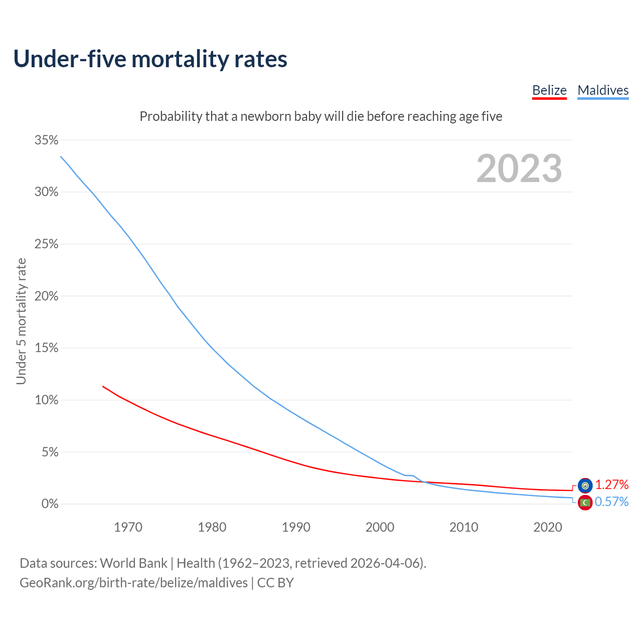 The chance that a newborn baby will die before reaching age five is 1.27% in Belize and 0.57% in Maldives. Above is a chart with historical data on under-five mortality rates.