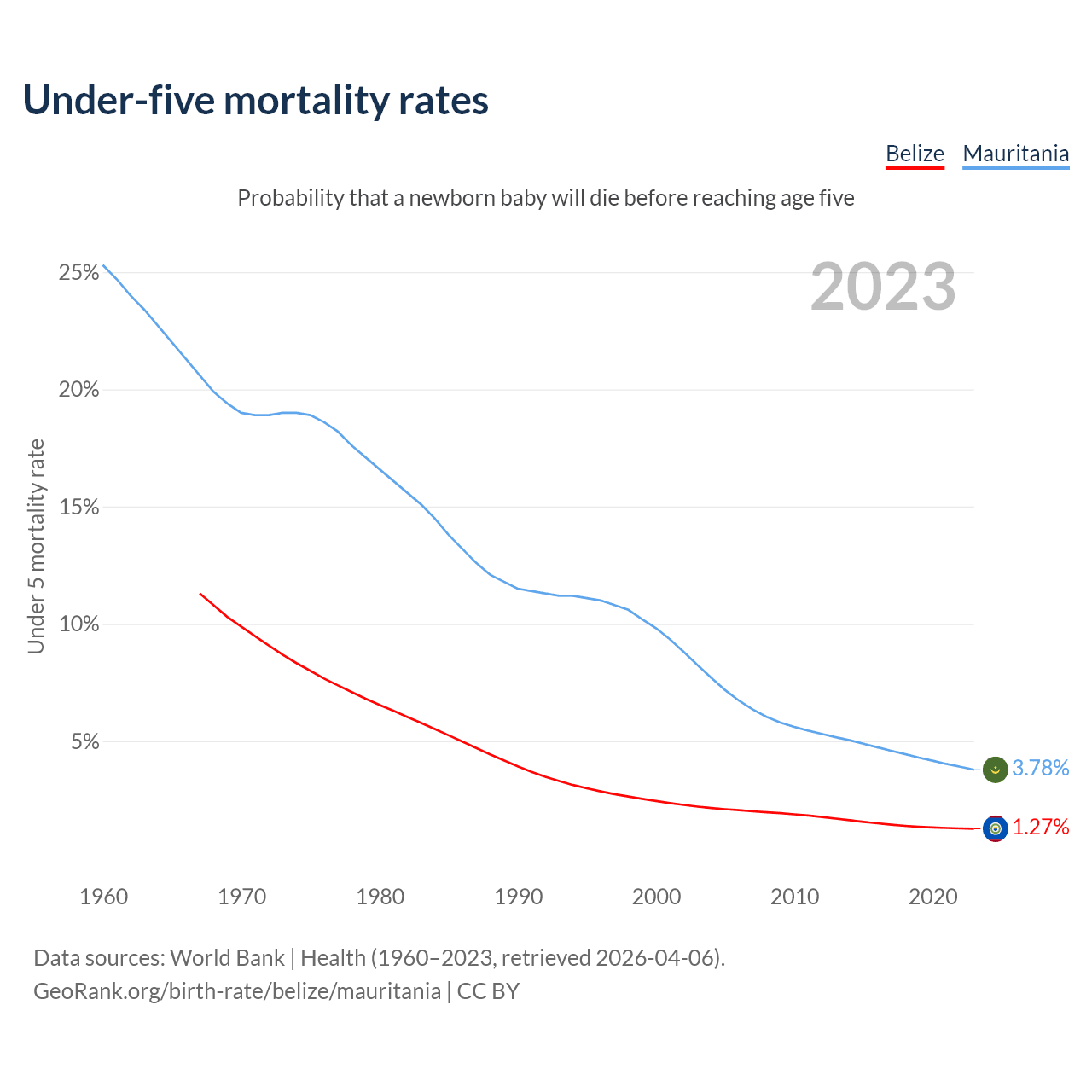 The chance that a newborn baby will die before reaching age five is 1.27% in Belize and 3.78% in Mauritania. Above is a chart with historical data on under-five mortality rates.