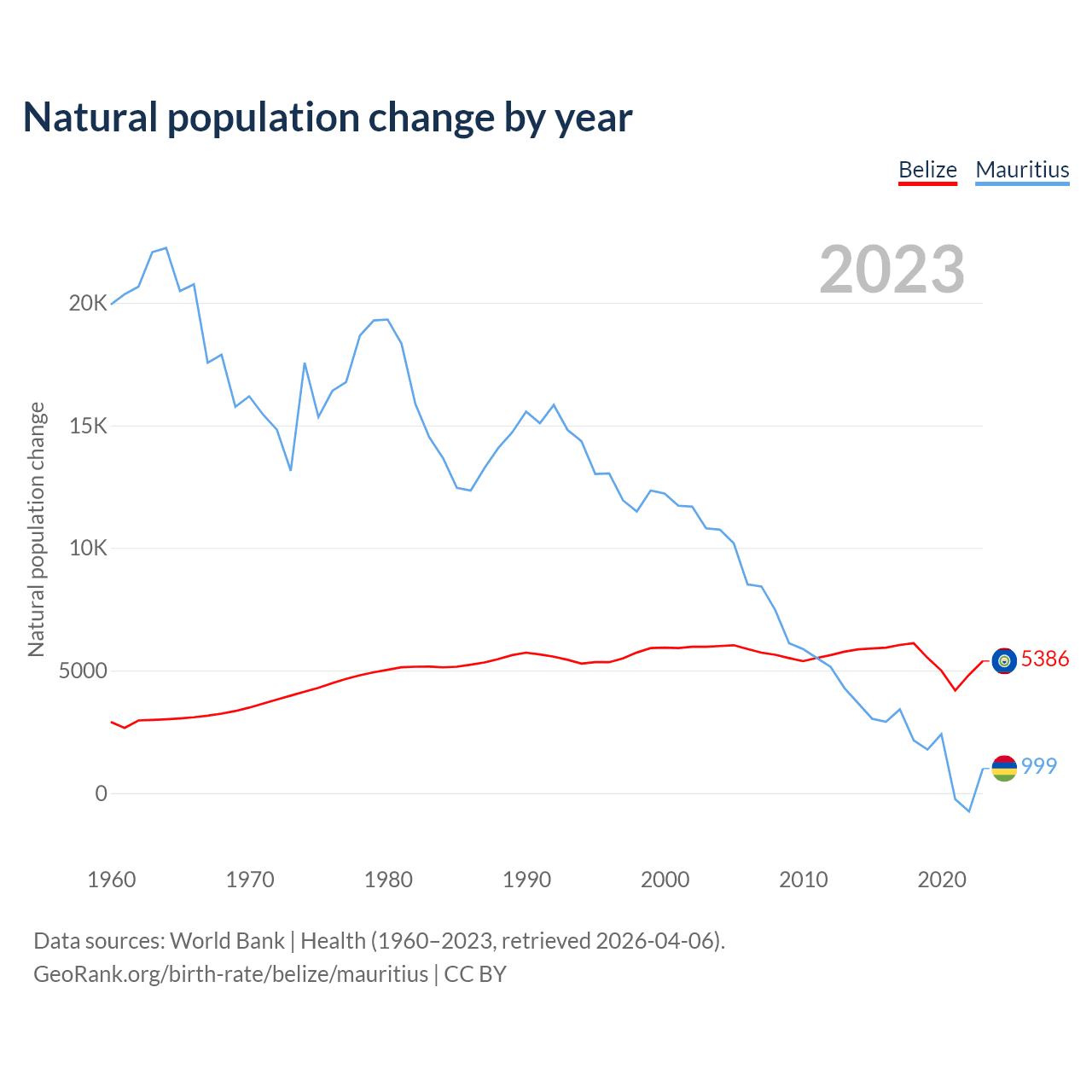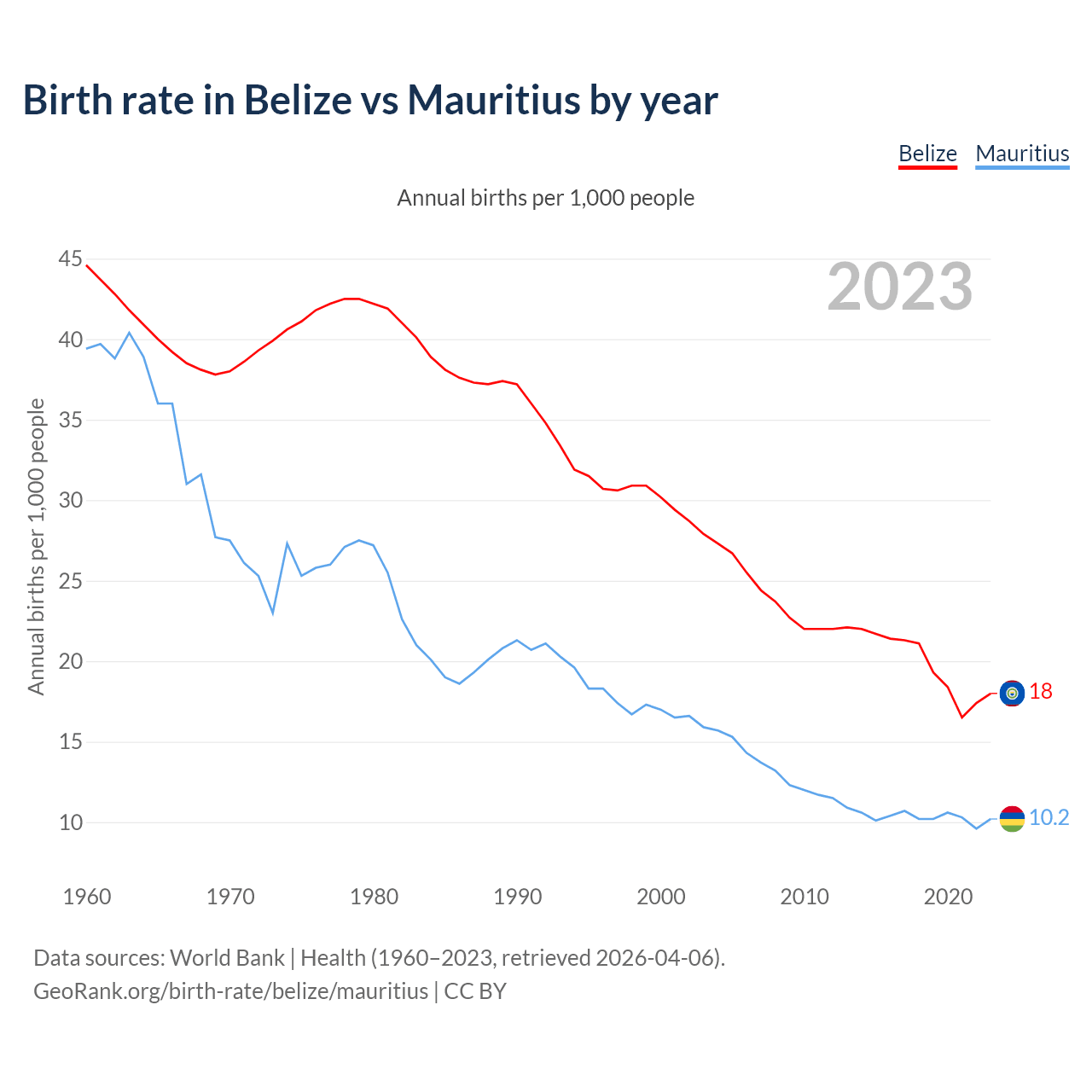 According to the latest available data on birth rates, the fertility rate in Belize was 2.01 children per woman in 2023, compared to 1.39 in Mauritius in 2023. The replacement level is considered to be 2.1 children per woman.