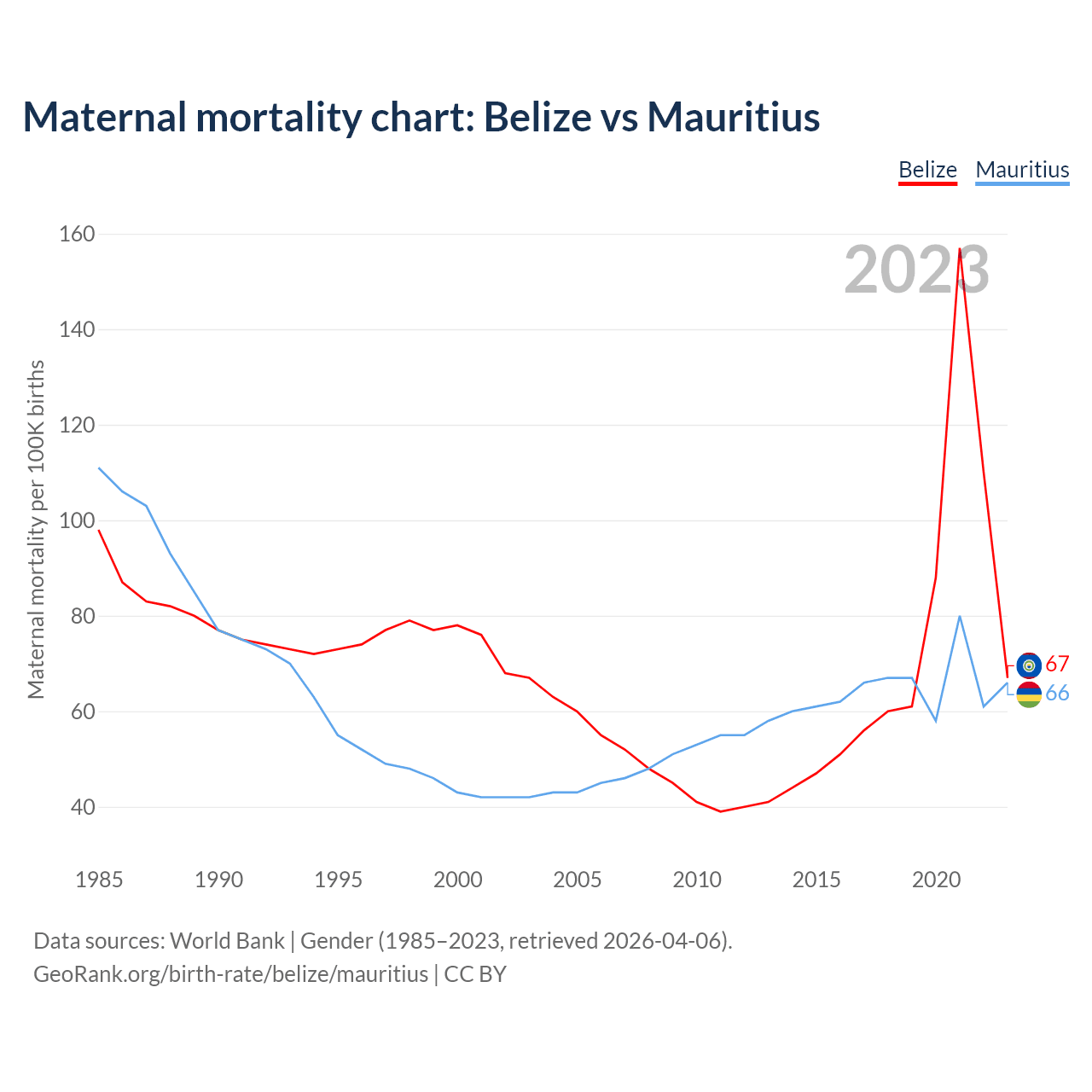 The maternal mortality rate, which is the probability of dying during childbirth or within 42 days of pregnancy termination, is 67 deaths per 100,000 live births in Belize, compared to 66 deaths in Mauritius.