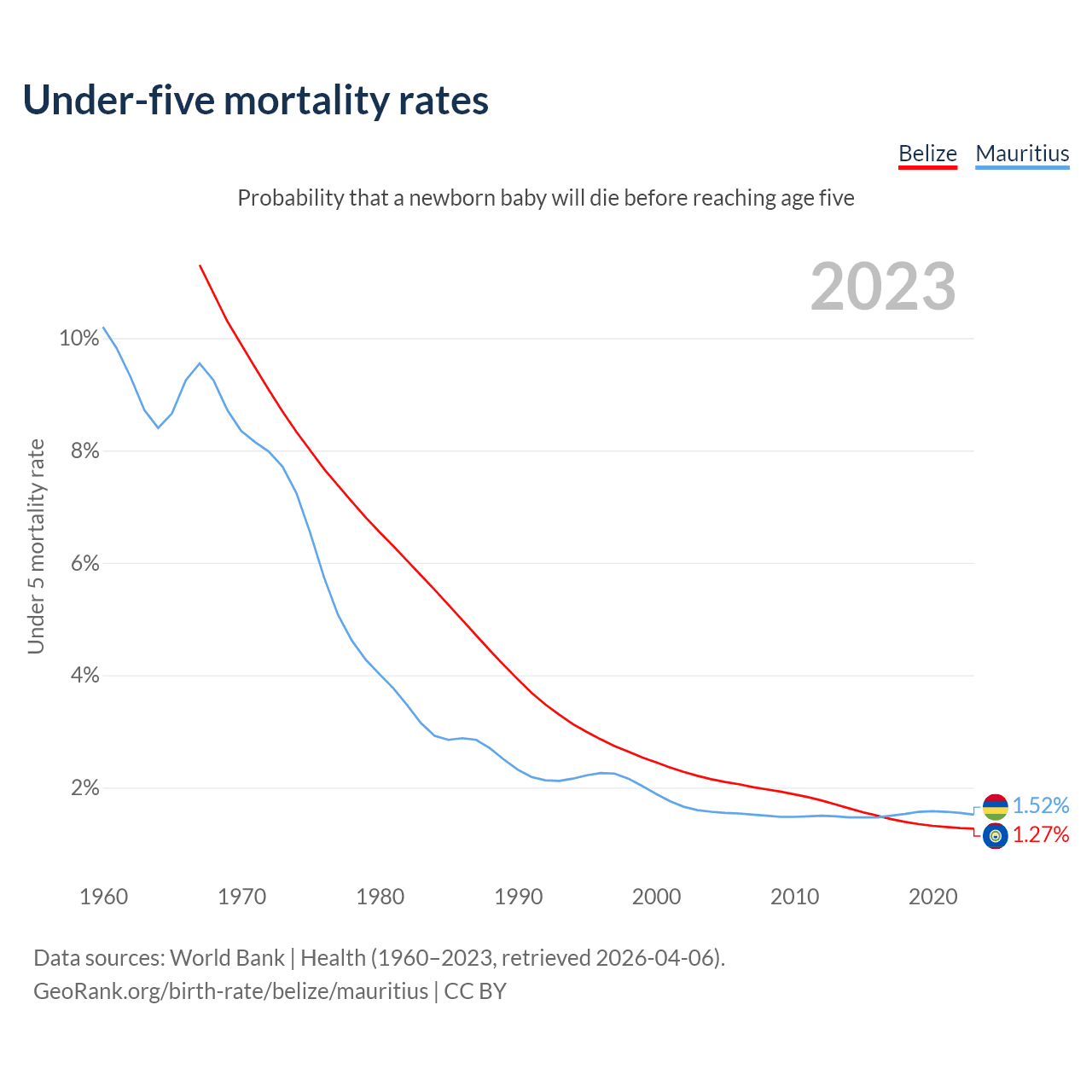 The chance that a newborn baby will die before reaching age five is 1.27% in Belize and 1.52% in Mauritius. Above is a chart with historical data on under-five mortality rates.