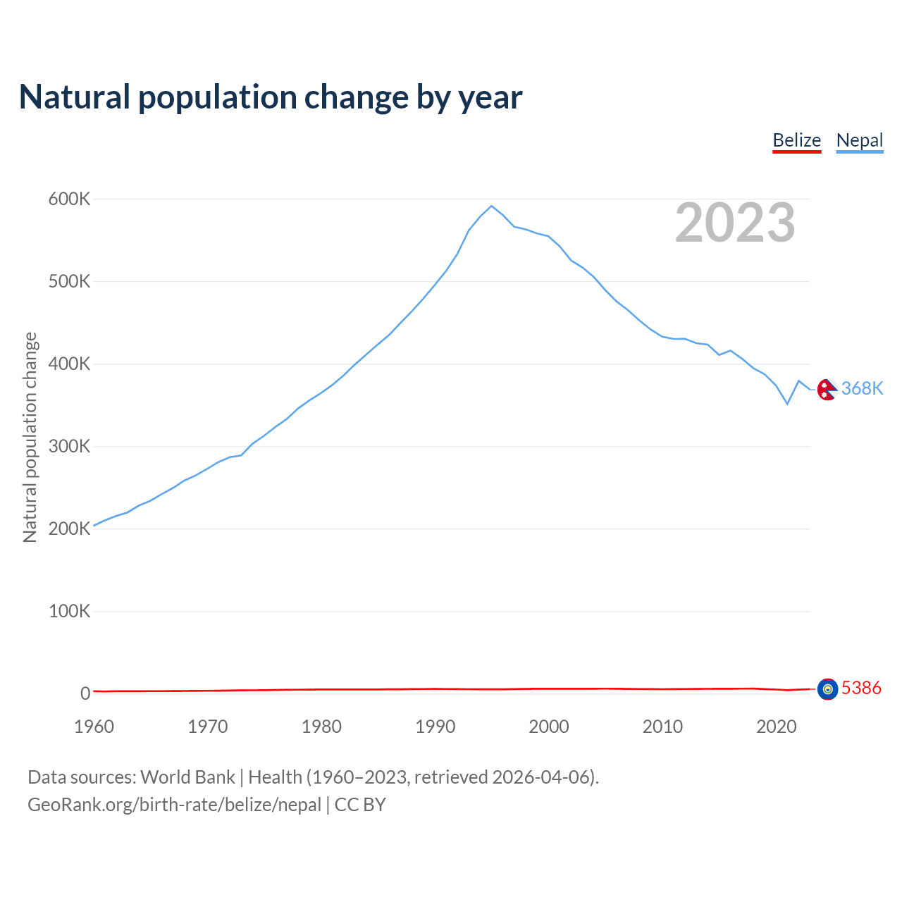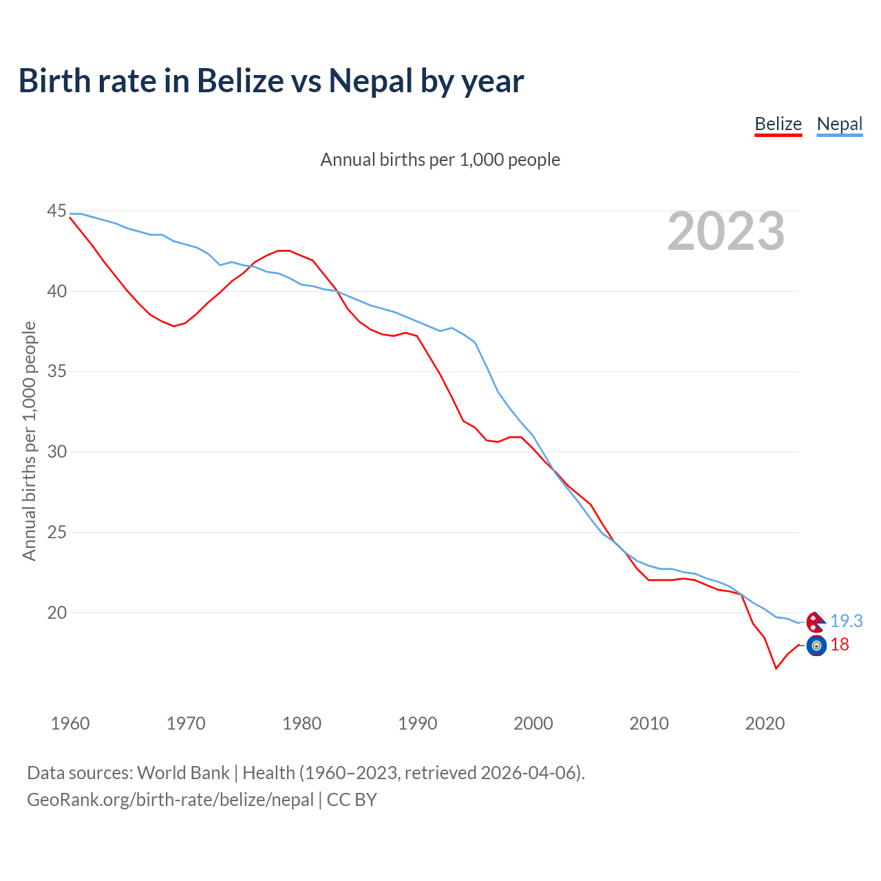 Belize has an annual birth rate of 18 births per 1,000 people, compared to 19.3 for Nepal. The average number of children a woman is expected to have during her lifetime — the fertility rate, is 2.01 in Belize and 1.98 in Nepal — 1.15% difference.