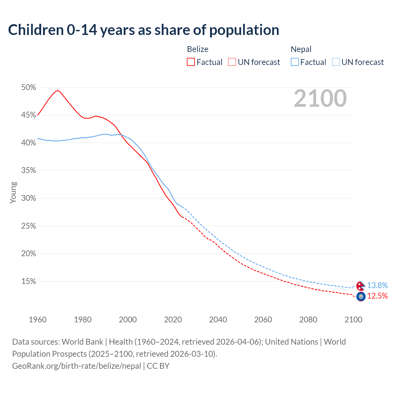 According to the latest available data on birth rates, the fertility rate in Belize was 2.01 children per woman in 2023, compared to 1.98 in Nepal in 2023. The replacement level is considered to be 2.1 children per woman.