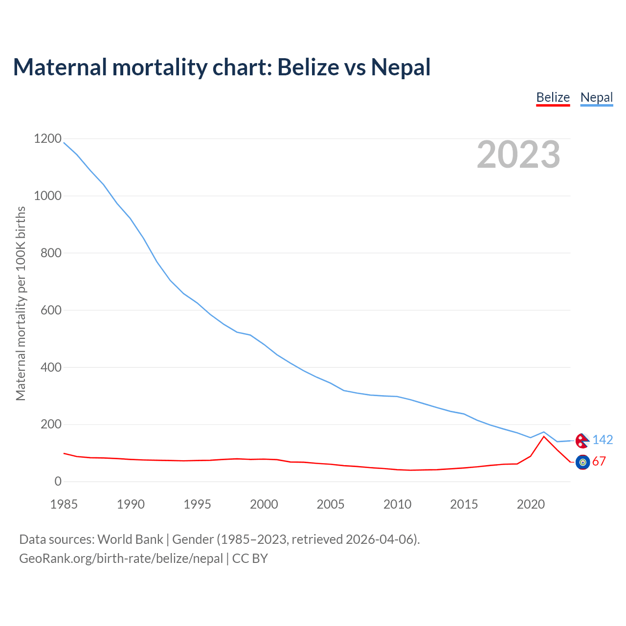 The maternal mortality rate, which is the probability of dying during childbirth or within 42 days of pregnancy termination, is 67 deaths per 100,000 live births in Belize, compared to 142 deaths in Nepal.