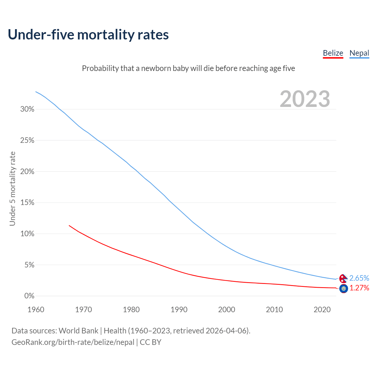 The chance that a newborn baby will die before reaching age five is 1.27% in Belize and 2.65% in Nepal. Above is a chart with historical data on under-five mortality rates.