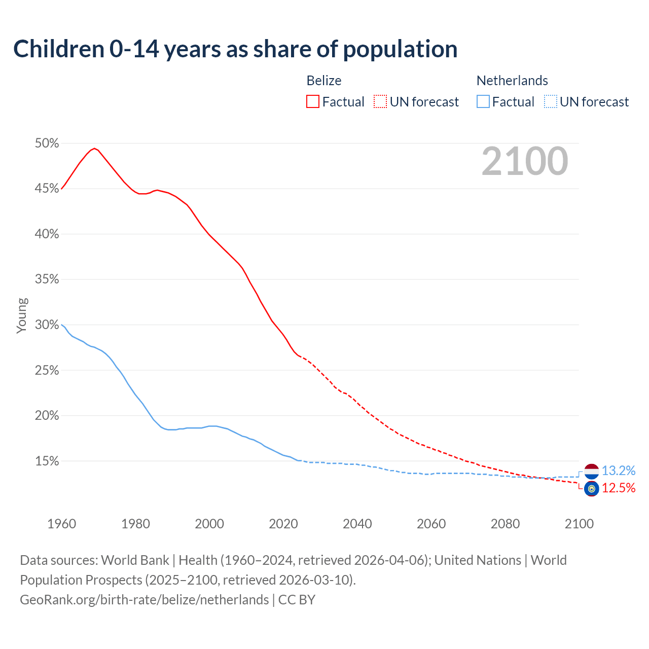 According to the latest available data on birth rates, the fertility rate in Belize was 2.01 children per woman in 2023, compared to 1.43 in the Netherlands in 2023. The replacement level is considered to be 2.1 children per woman.