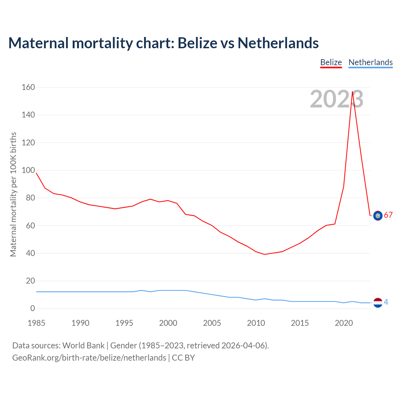 The maternal mortality rate, which is the probability of dying during childbirth or within 42 days of pregnancy termination, is 67 deaths per 100,000 live births in Belize, compared to 4 deaths in the Netherlands.