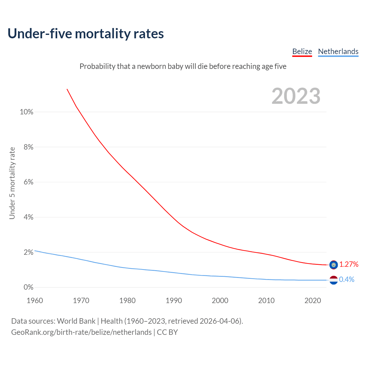 The chance that a newborn baby will die before reaching age five is 1.27% in Belize and 0.4% in the Netherlands. Above is a chart with historical data on under-five mortality rates.