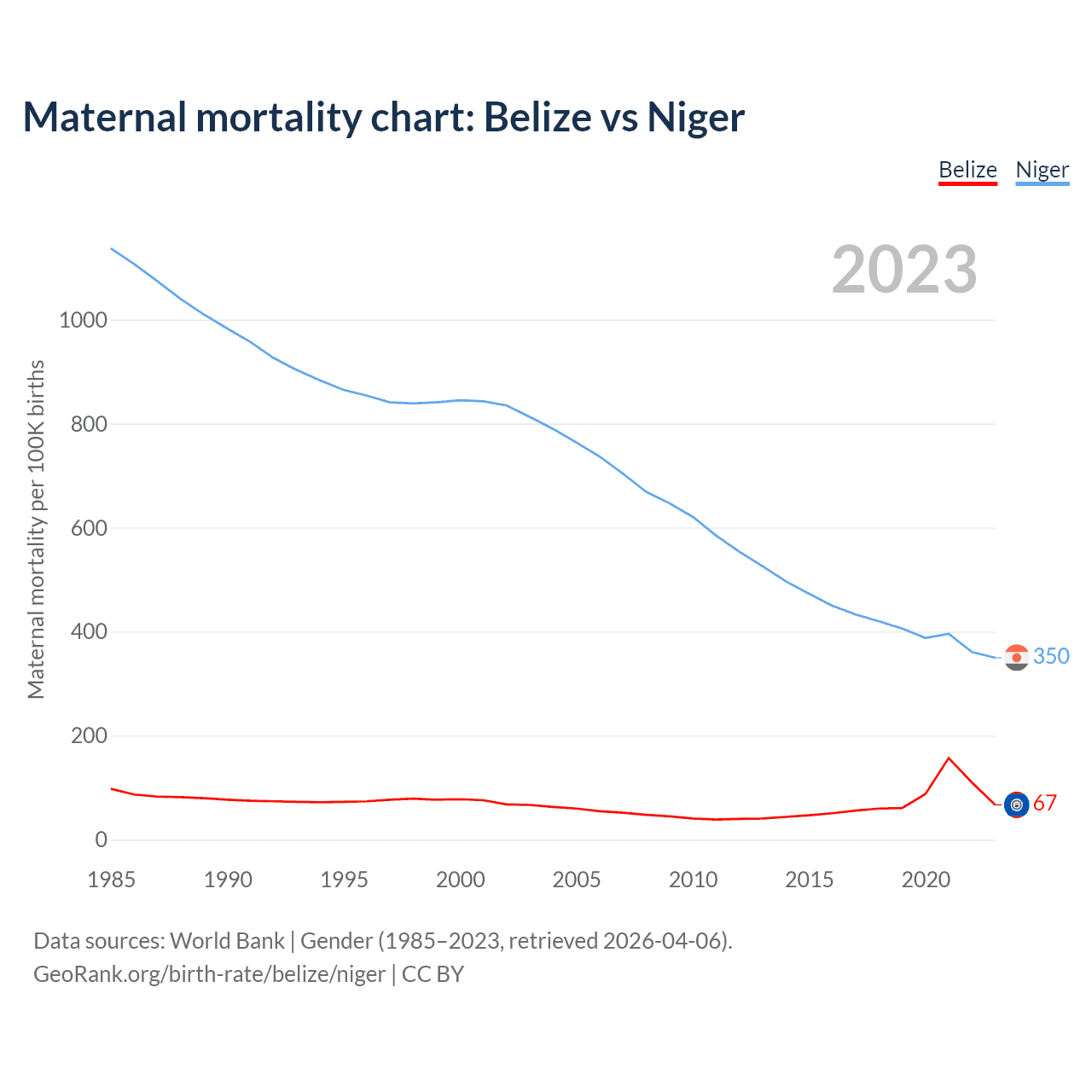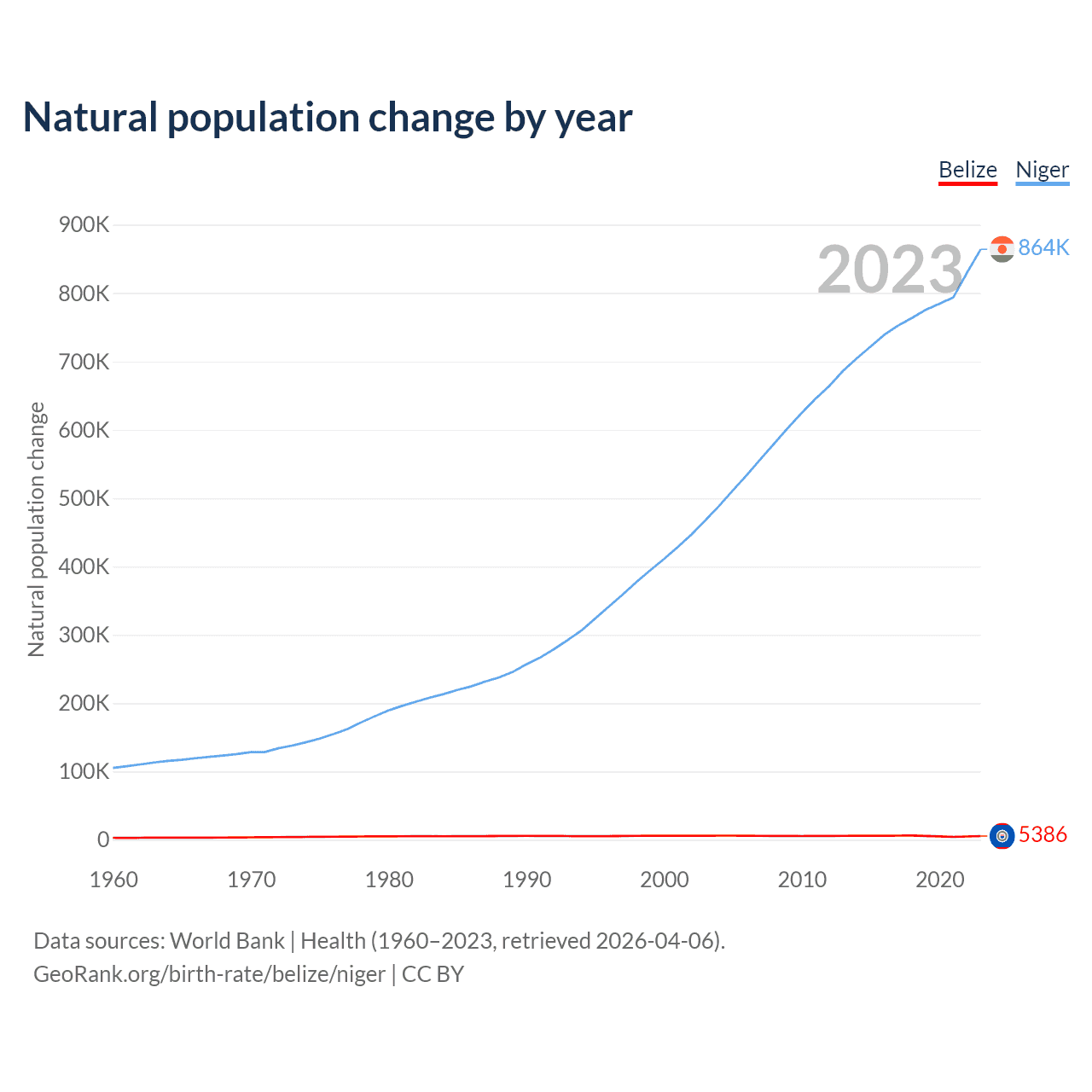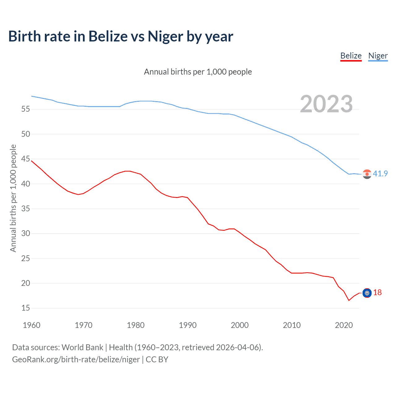 Belize has an annual birth rate of 18 births per 1,000 people, compared to 41.9 for Niger. The average number of children a woman is expected to have during her lifetime — the fertility rate, is 2.01 in Belize and 6.06 in Niger — 202% difference.