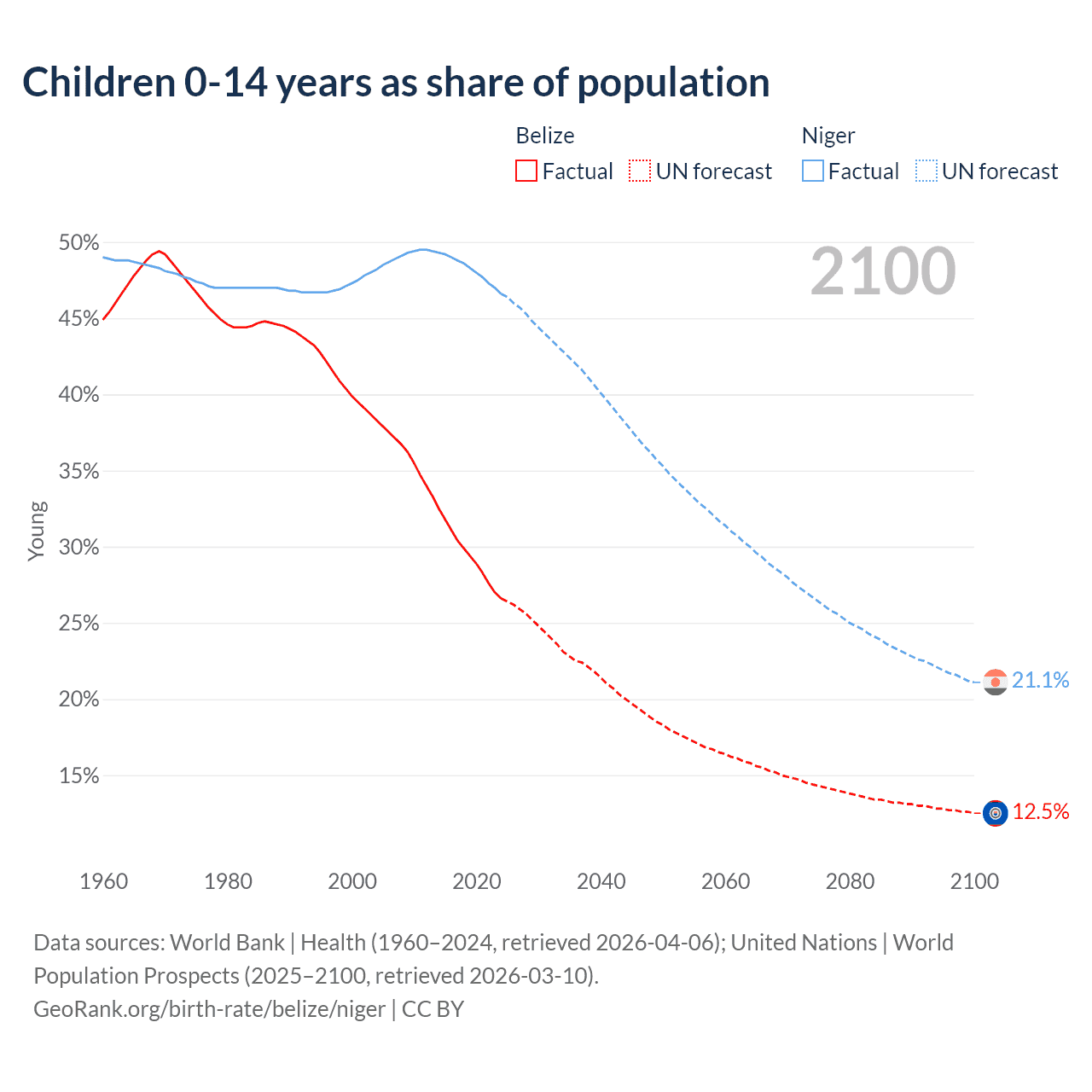 According to the latest available data on birth rates, the fertility rate in Belize was 2.01 children per woman in 2023, compared to 6.06 in Niger in 2023. The replacement level is considered to be 2.1 children per woman.