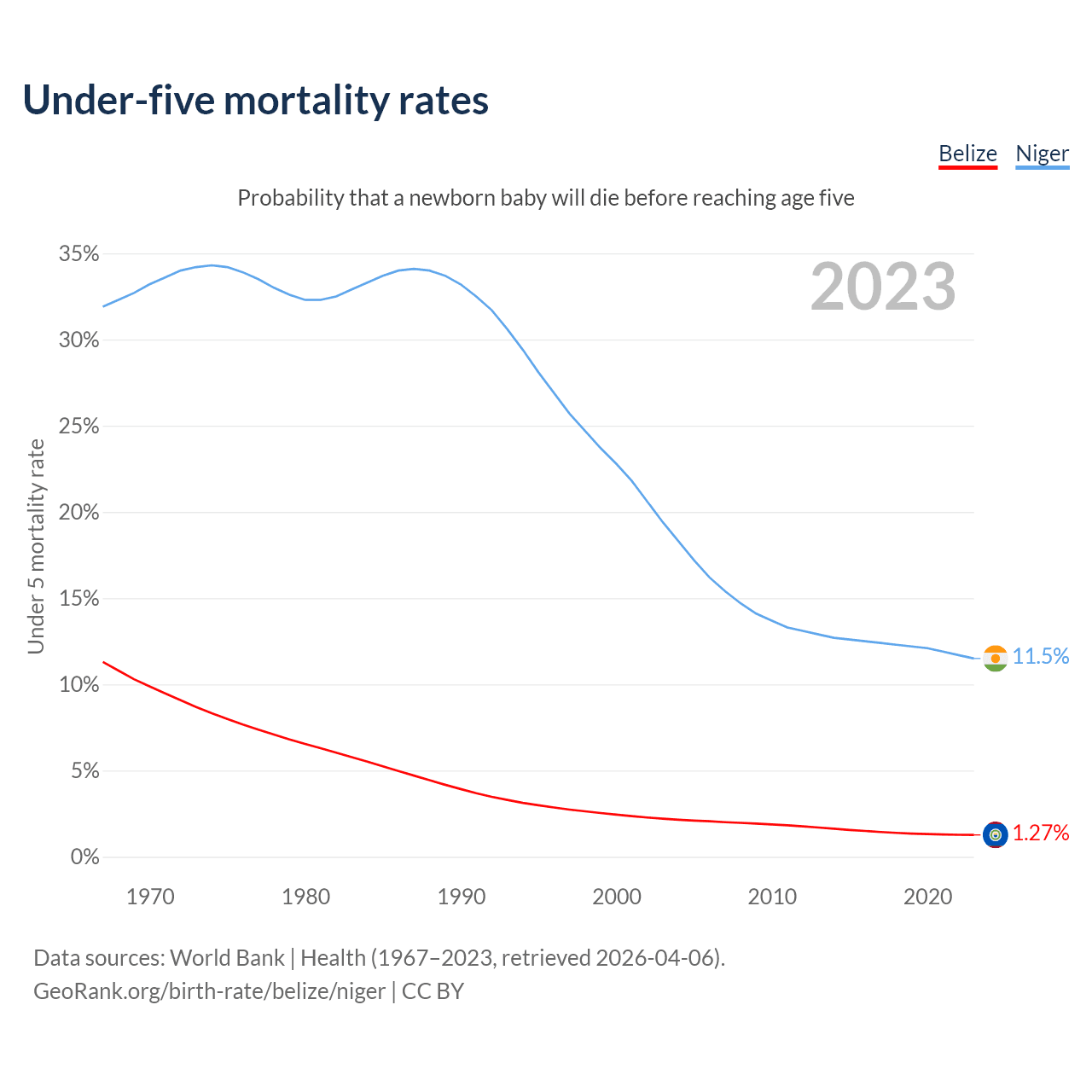 The chance that a newborn baby will die before reaching age five is 1.27% in Belize and 11.5% in Niger. Above is a chart with historical data on under-five mortality rates.