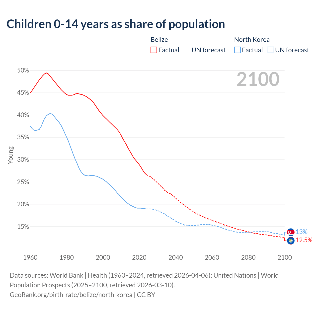 According to the latest available data on birth rates, the fertility rate in Belize was 2.01 children per woman in 2023, compared to 1.78 in North Korea in 2023. The replacement level is considered to be 2.1 children per woman.