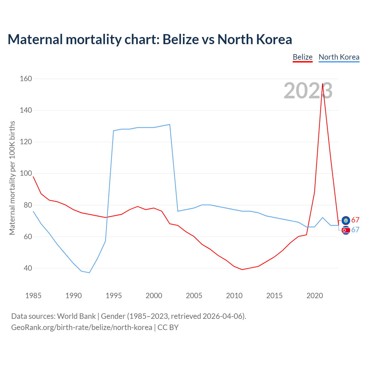 The maternal mortality rate, which is the probability of dying during childbirth or within 42 days of pregnancy termination, is 67 deaths per 100,000 live births in Belize, compared to 67 deaths in North Korea.
