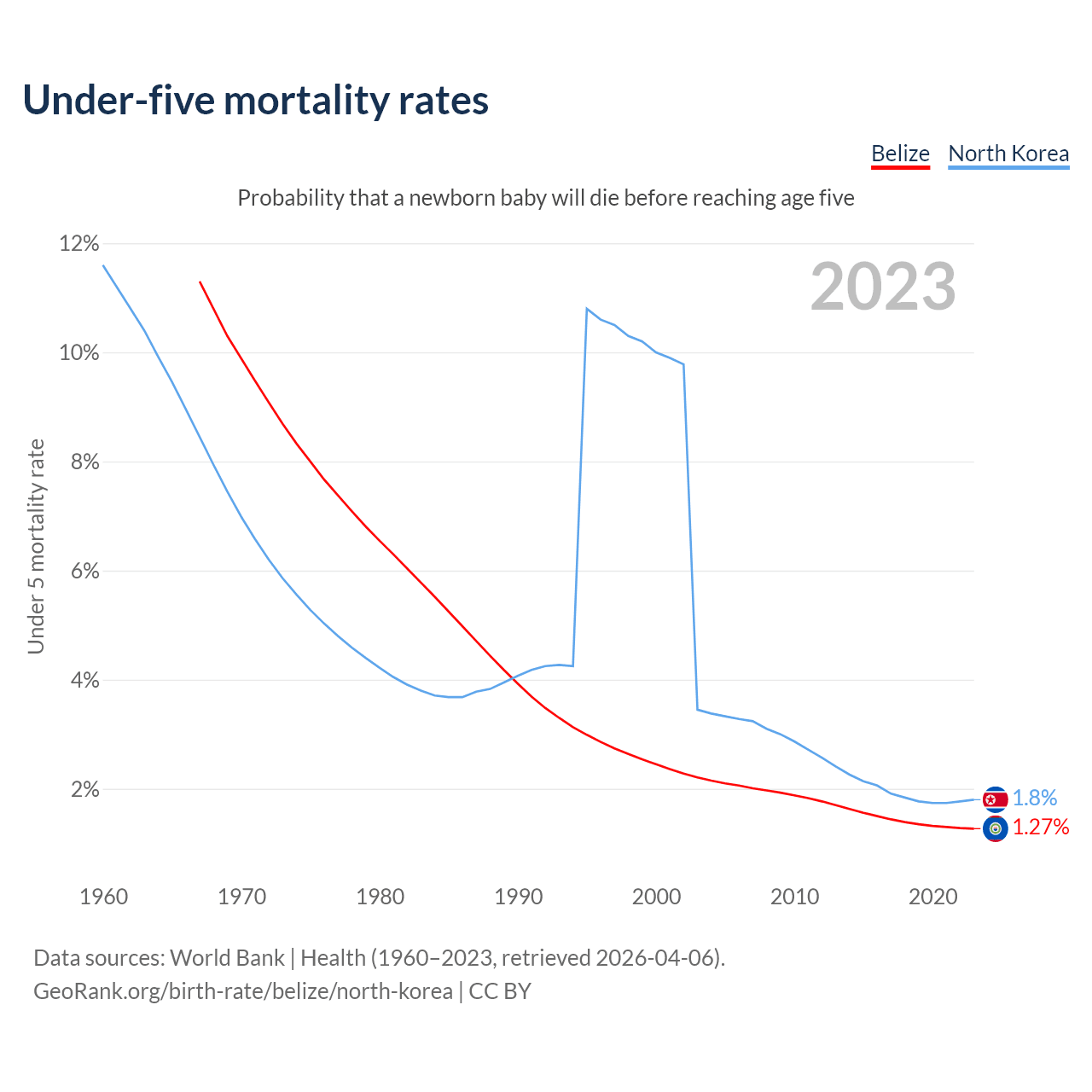 The chance that a newborn baby will die before reaching age five is 1.27% in Belize and 1.8% in North Korea. Above is a chart with historical data on under-five mortality rates.
