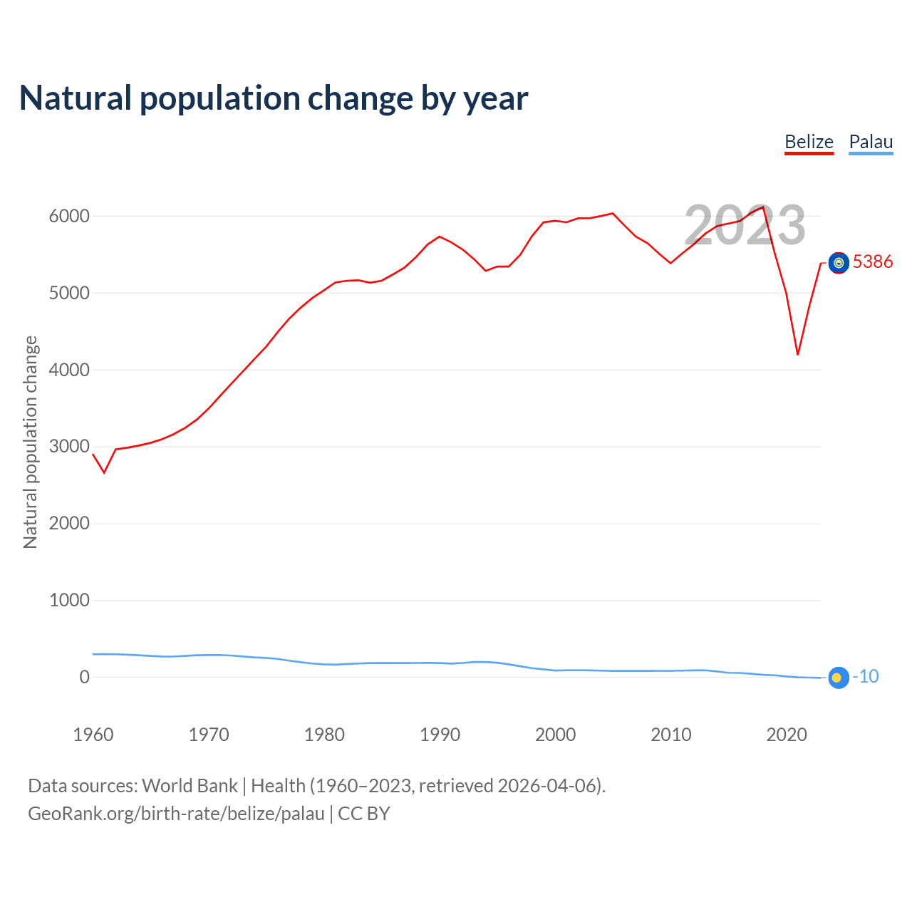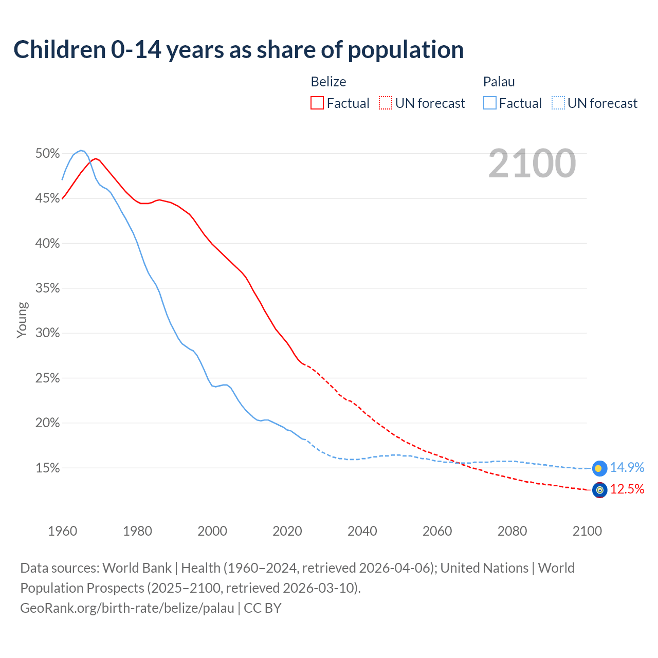 According to the latest available data on birth rates, the fertility rate in Belize was 2.01 children per woman in 2023, compared to 1.91 in Palau in 2023. The replacement level is considered to be 2.1 children per woman.