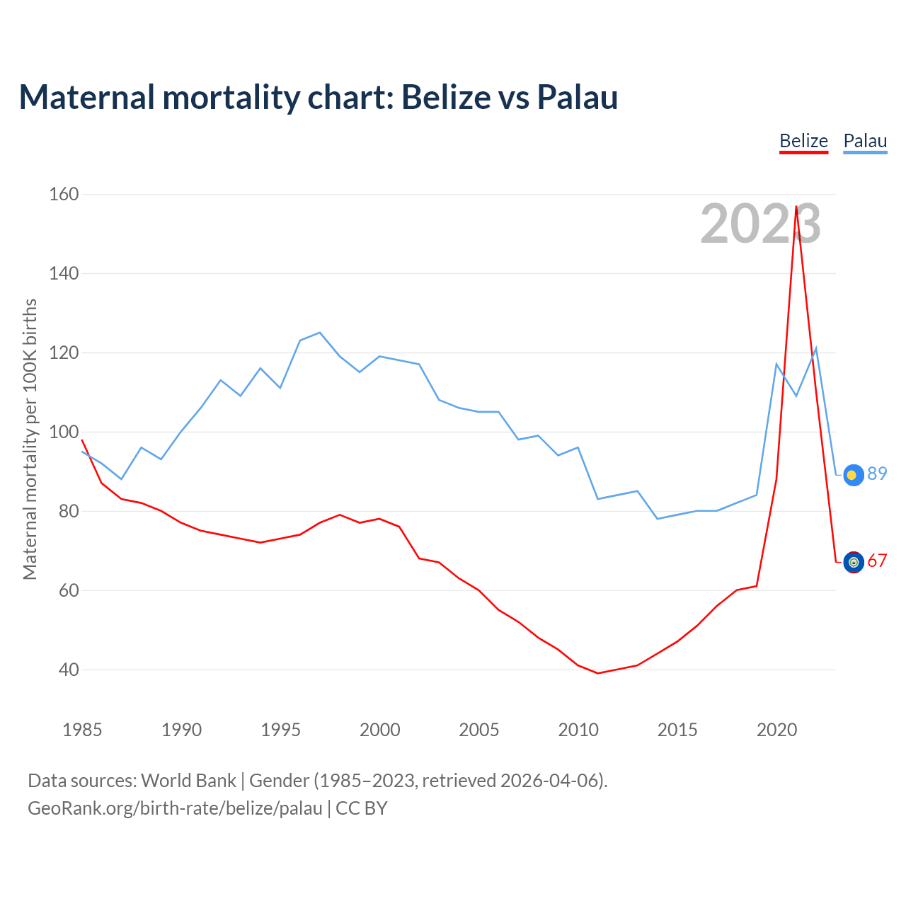 The maternal mortality rate, which is the probability of dying during childbirth or within 42 days of pregnancy termination, is 67 deaths per 100,000 live births in Belize, compared to 89 deaths in Palau.