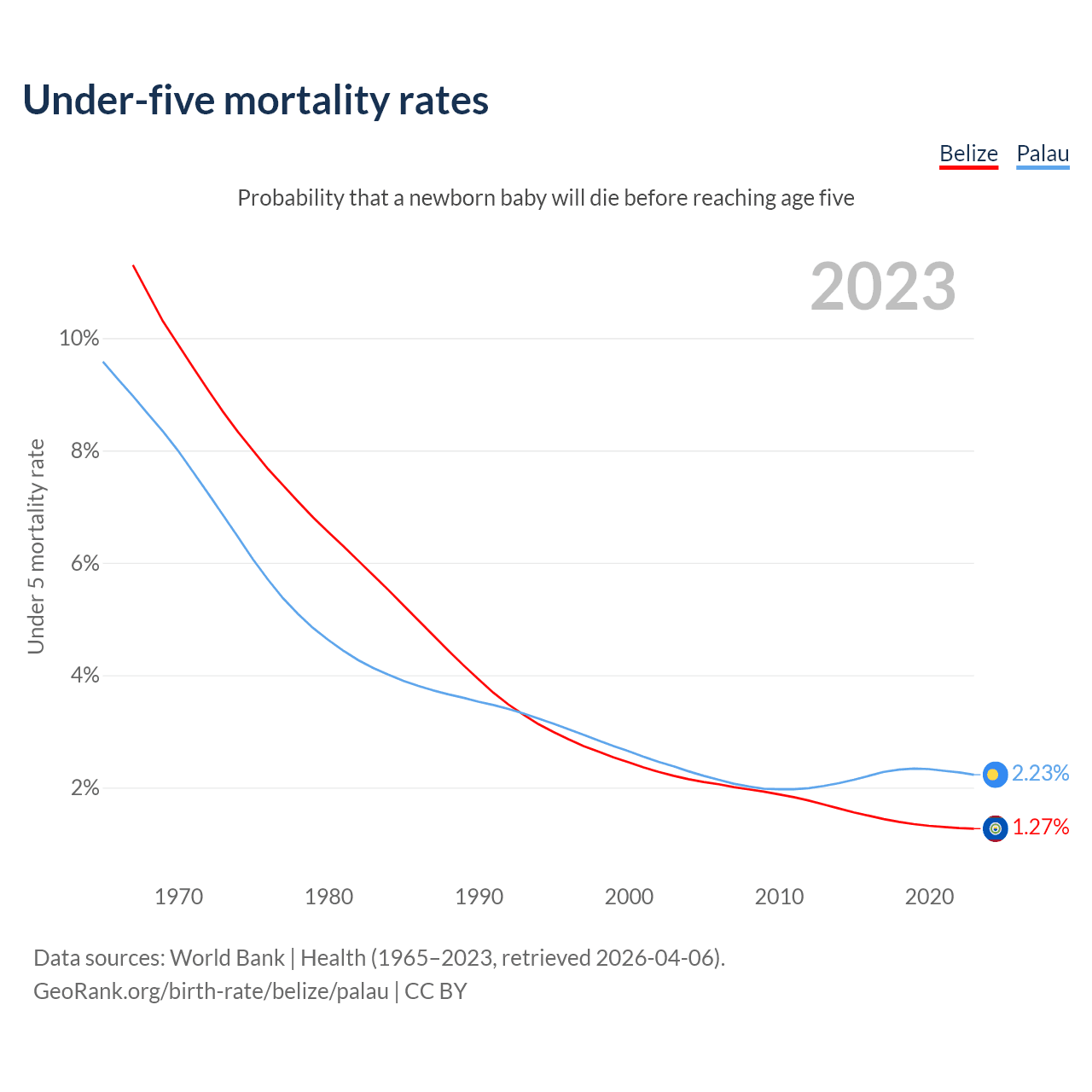 The chance that a newborn baby will die before reaching age five is 1.27% in Belize and 2.23% in Palau. Above is a chart with historical data on under-five mortality rates.