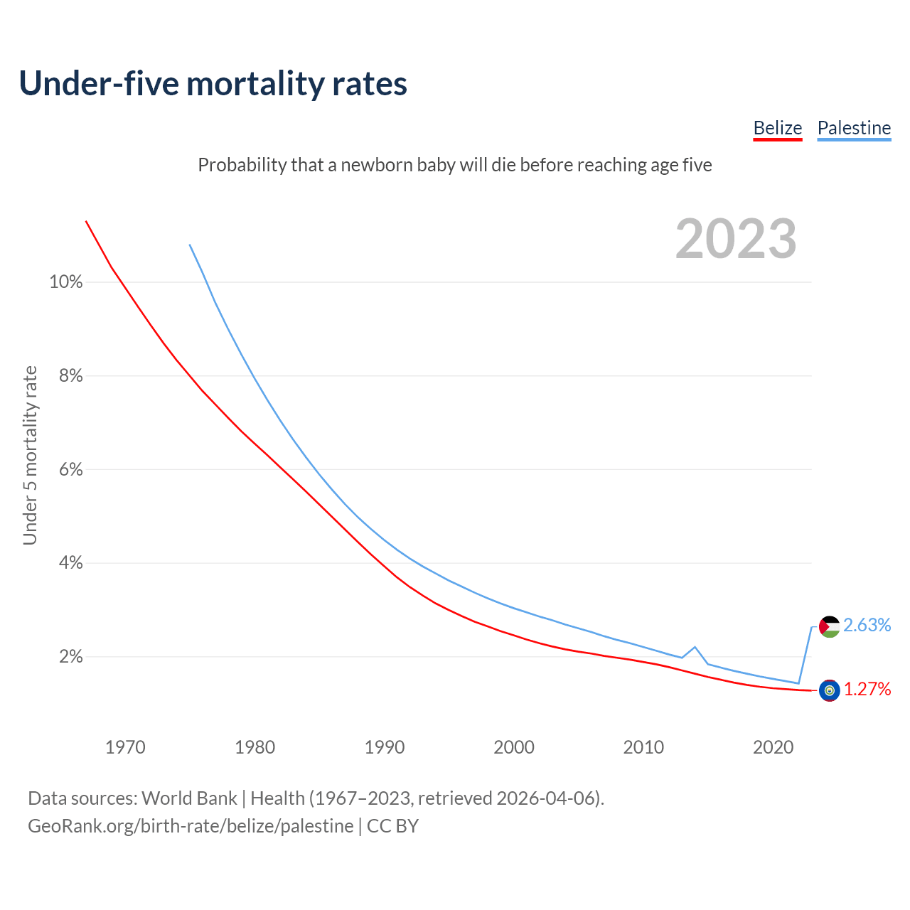 The chance that a newborn baby will die before reaching age five is 1.27% in Belize and 2.63% in Palestine. Above is a chart with historical data on under-five mortality rates.