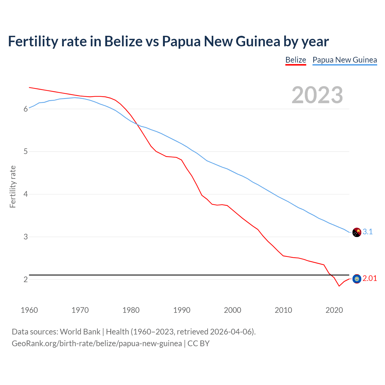 1960 vs 2023, the fertility rate has decreased by 69.1% in Belize and by 48.5% in Papua New Guinea — in 1960, it was 6.5 and 6.02, respectively.