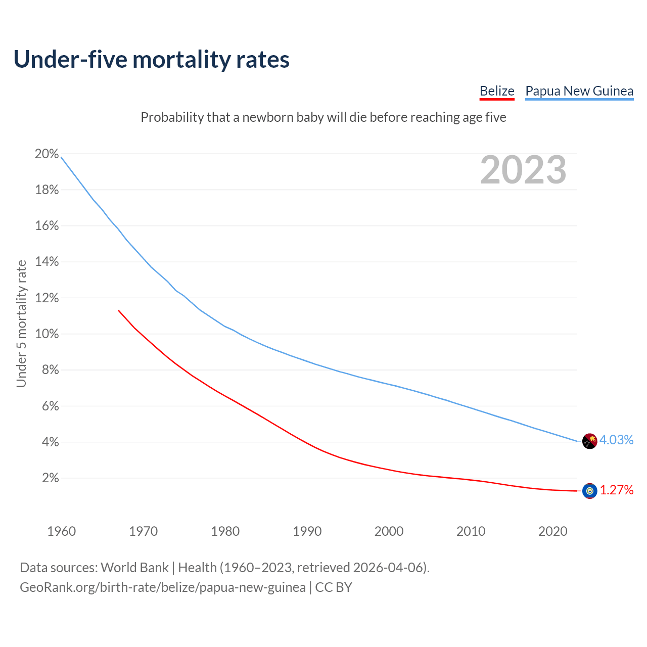 The chance that a newborn baby will die before reaching age five is 1.27% in Belize and 4.03% in Papua New Guinea. Above is a chart with historical data on under-five mortality rates.