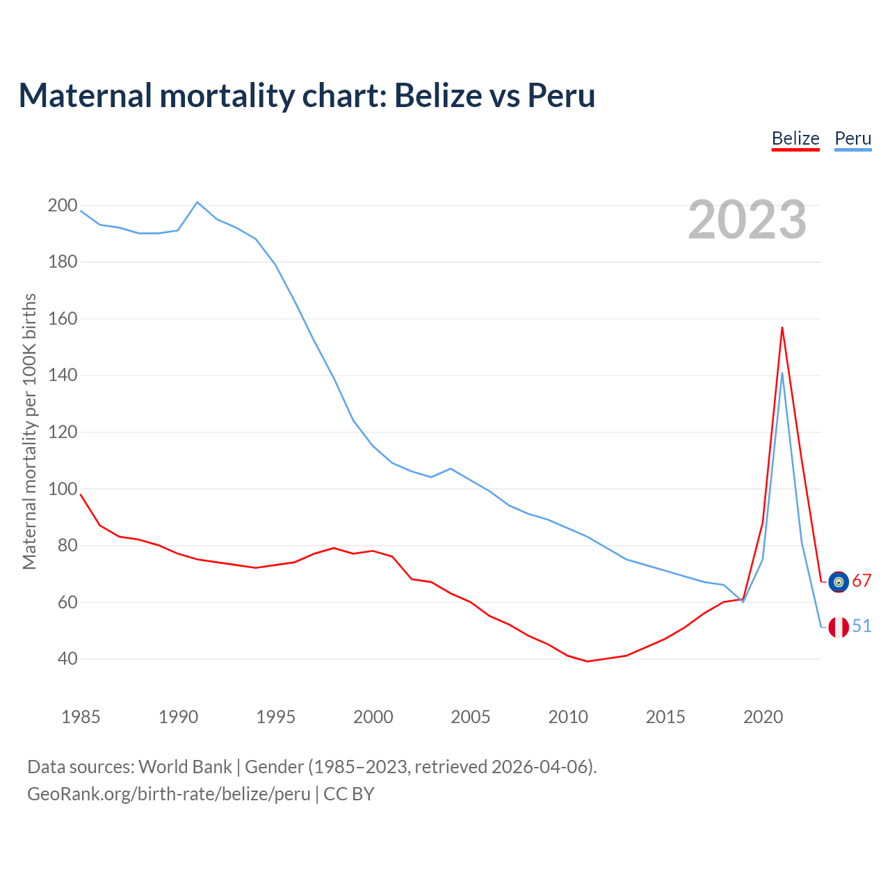 The maternal mortality rate, which is the probability of dying during childbirth or within 42 days of pregnancy termination, is 67 deaths per 100,000 live births in Belize, compared to 51 deaths in Peru.