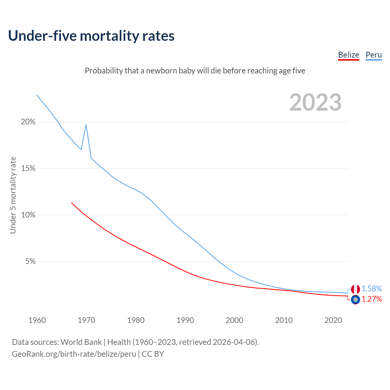 The chance that a newborn baby will die before reaching age five is 1.27% in Belize and 1.58% in Peru. Above is a chart with historical data on under-five mortality rates.