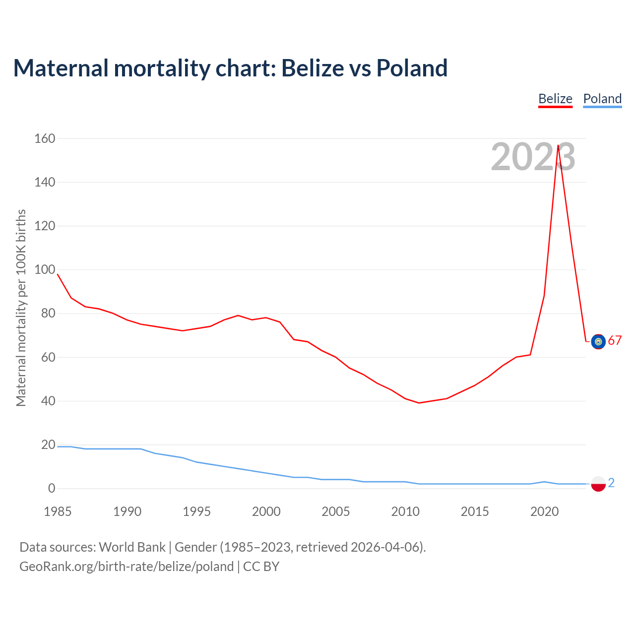 The maternal mortality rate, which is the probability of dying during childbirth or within 42 days of pregnancy termination, is 67 deaths per 100,000 live births in Belize, compared to 2 deaths in Poland.