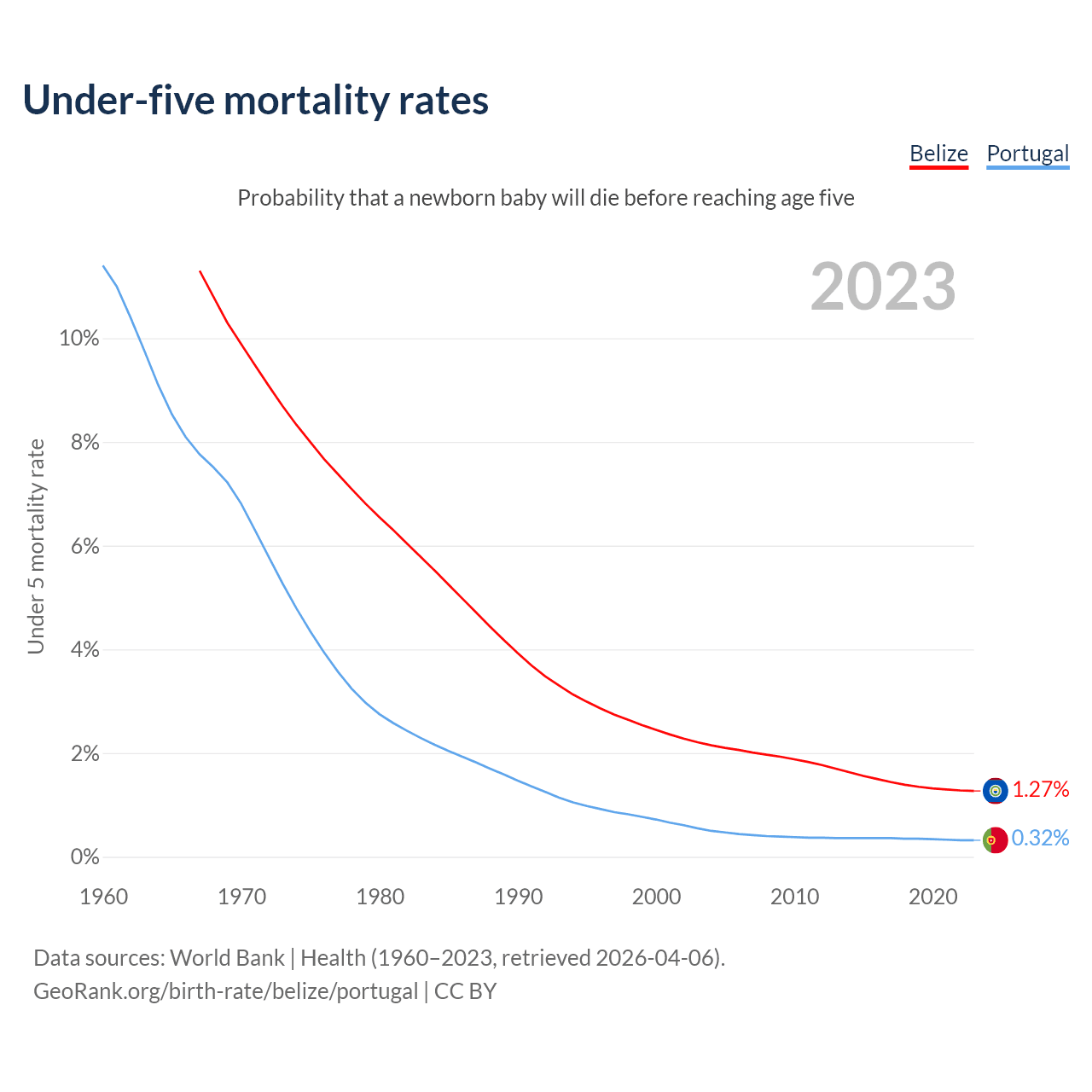 The chance that a newborn baby will die before reaching age five is 1.27% in Belize and 0.32% in Portugal. Above is a chart with historical data on under-five mortality rates.