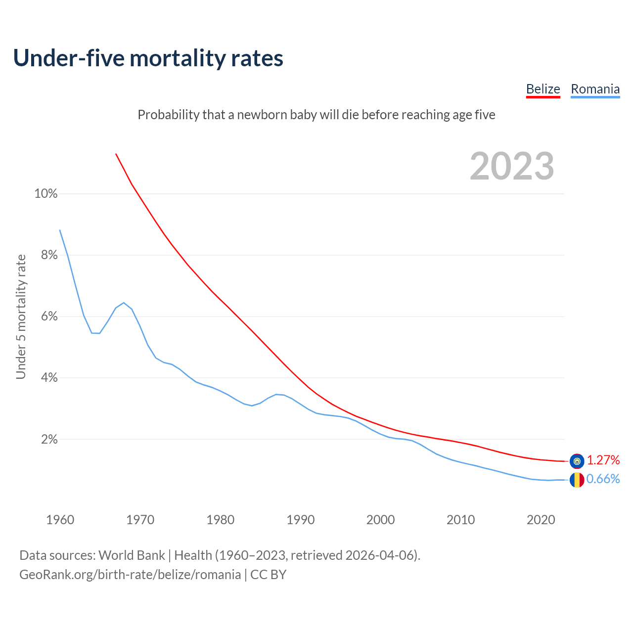 The chance that a newborn baby will die before reaching age five is 1.27% in Belize and 0.66% in Romania. Above is a chart with historical data on under-five mortality rates.