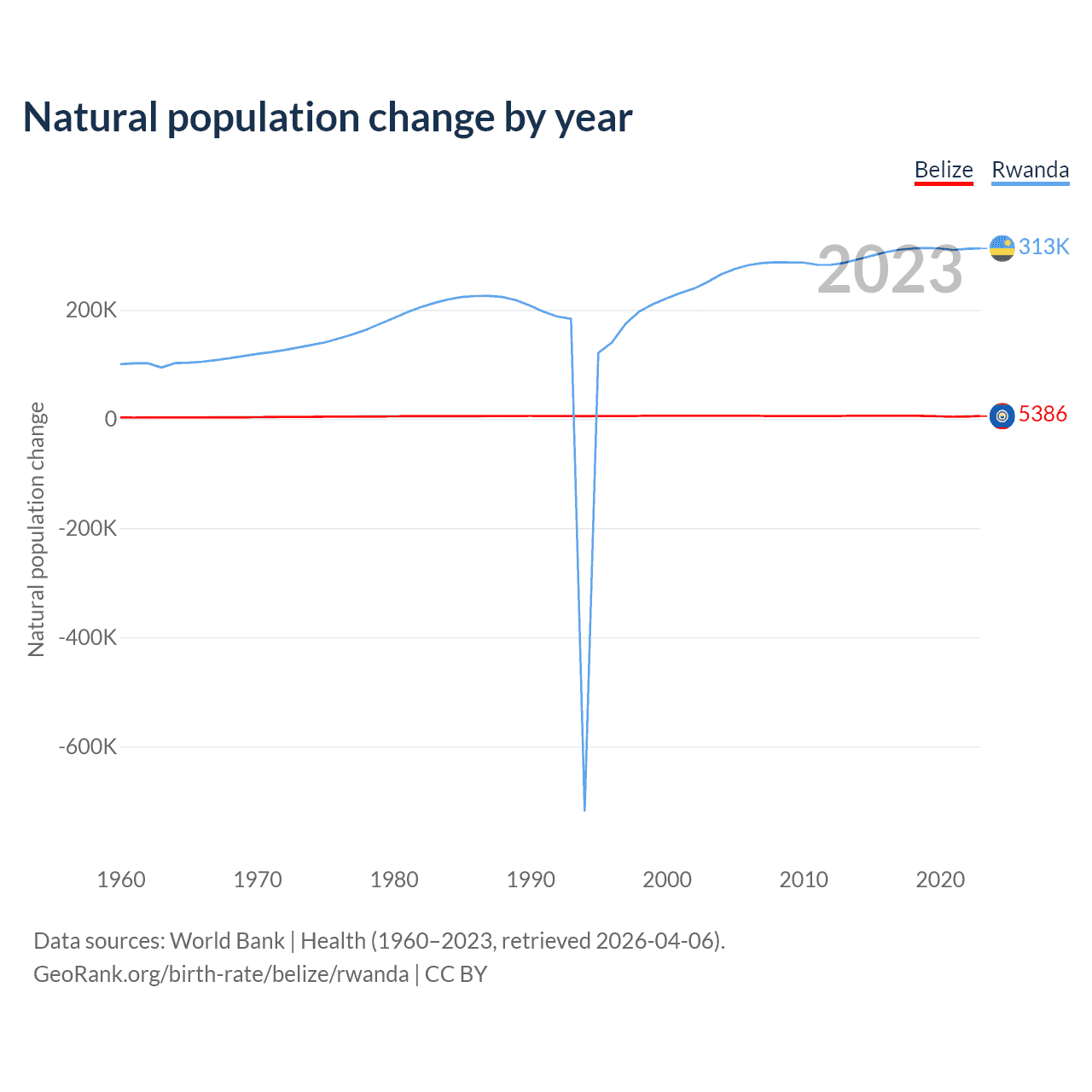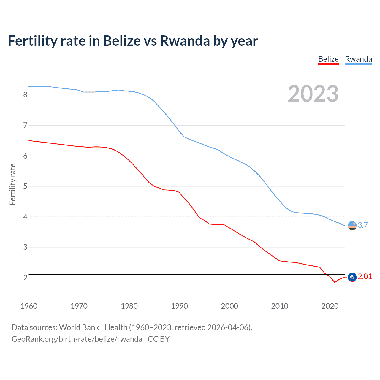 According to the latest available data on birth rates, the fertility rate in Belize was 2.01 children per woman in 2023, compared to 3.7 in Rwanda in 2023. The replacement level is considered to be 2.1 children per woman.