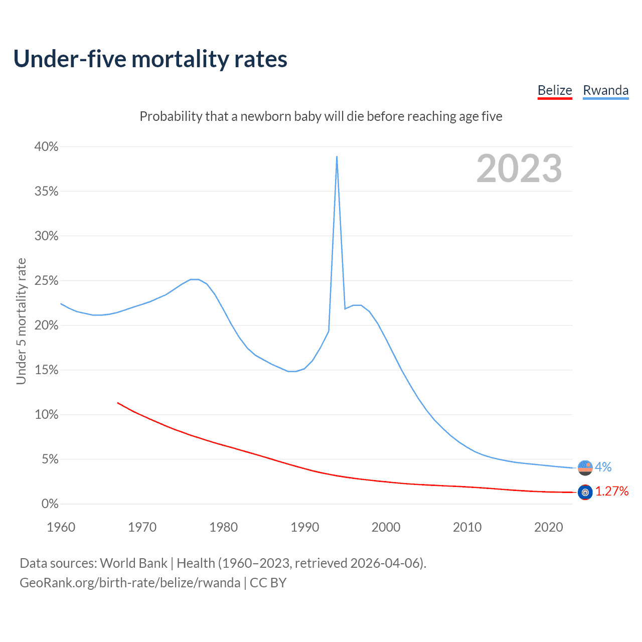 The chance that a newborn baby will die before reaching age five is 1.27% in Belize and 4% in Rwanda. Above is a chart with historical data on under-five mortality rates.