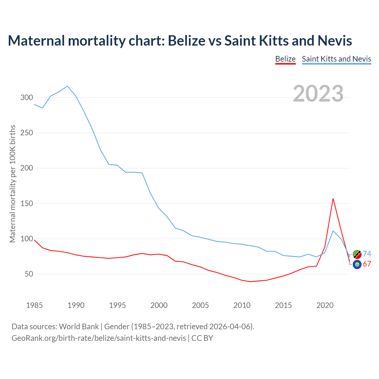 The maternal mortality rate, which is the probability of dying during childbirth or within 42 days of pregnancy termination, is 67 deaths per 100,000 live births in Belize, compared to 74 deaths in Saint Kitts and Nevis.