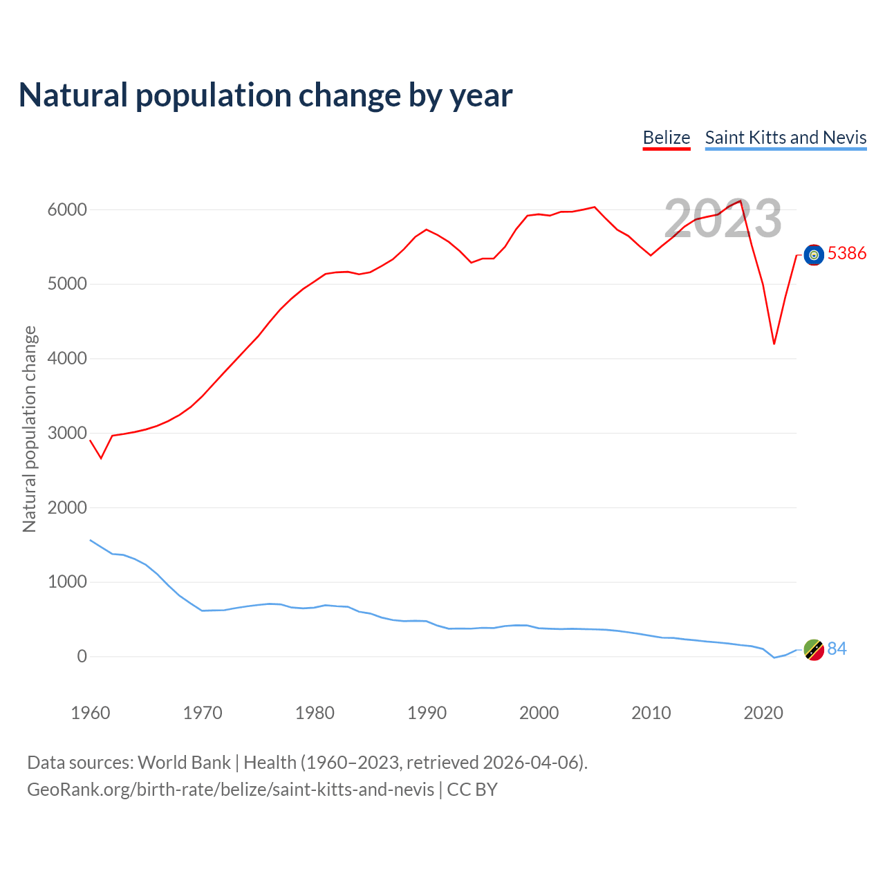 According to the latest available data on birth rates, the fertility rate in Belize was 2.01 children per woman in 2023, compared to 1.51 in Saint Kitts and Nevis in 2023. The replacement level is considered to be 2.1 children per woman.