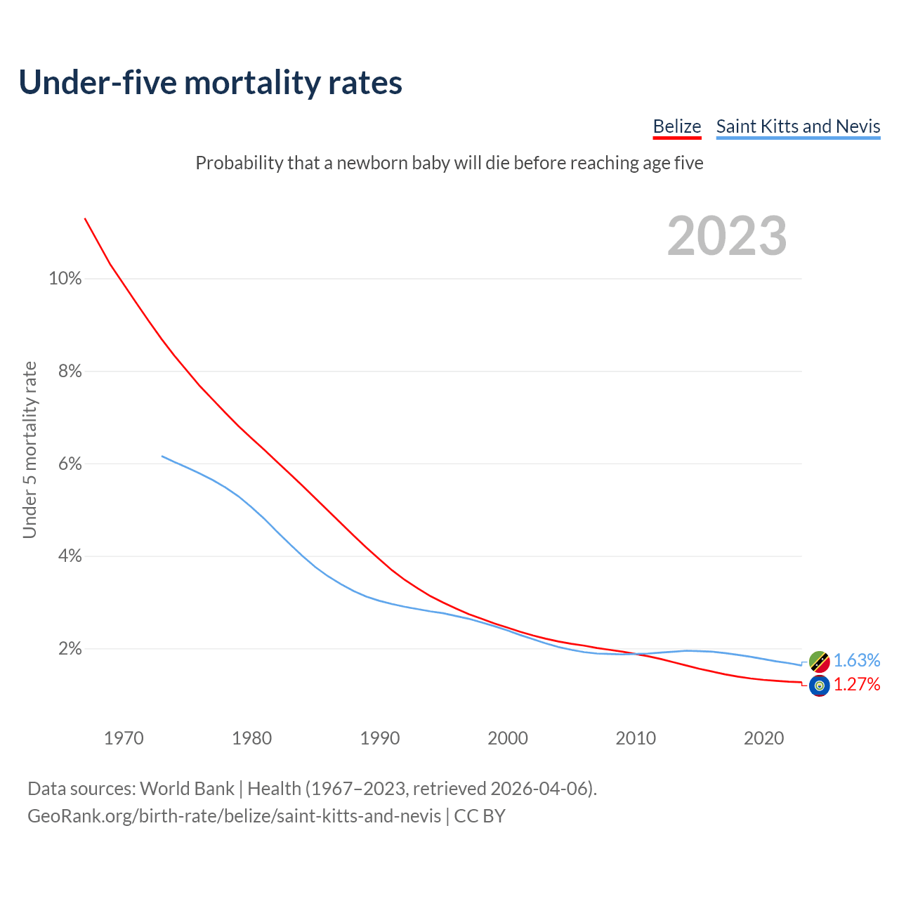The chance that a newborn baby will die before reaching age five is 1.27% in Belize and 1.63% in Saint Kitts and Nevis. Above is a chart with historical data on under-five mortality rates.