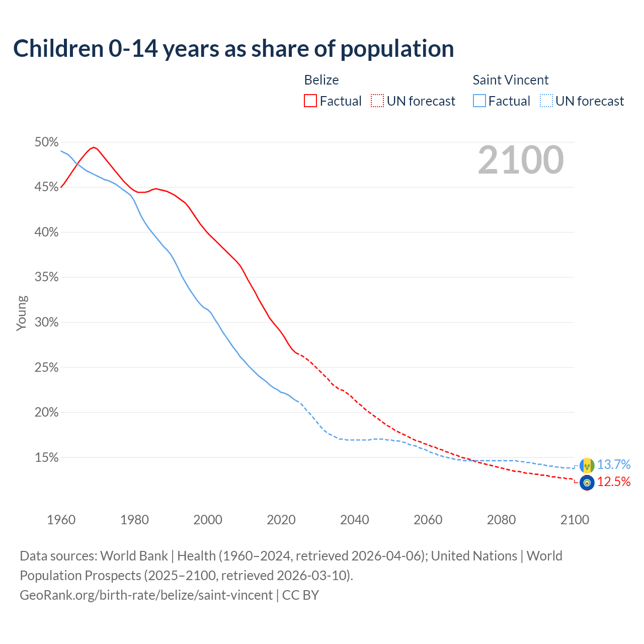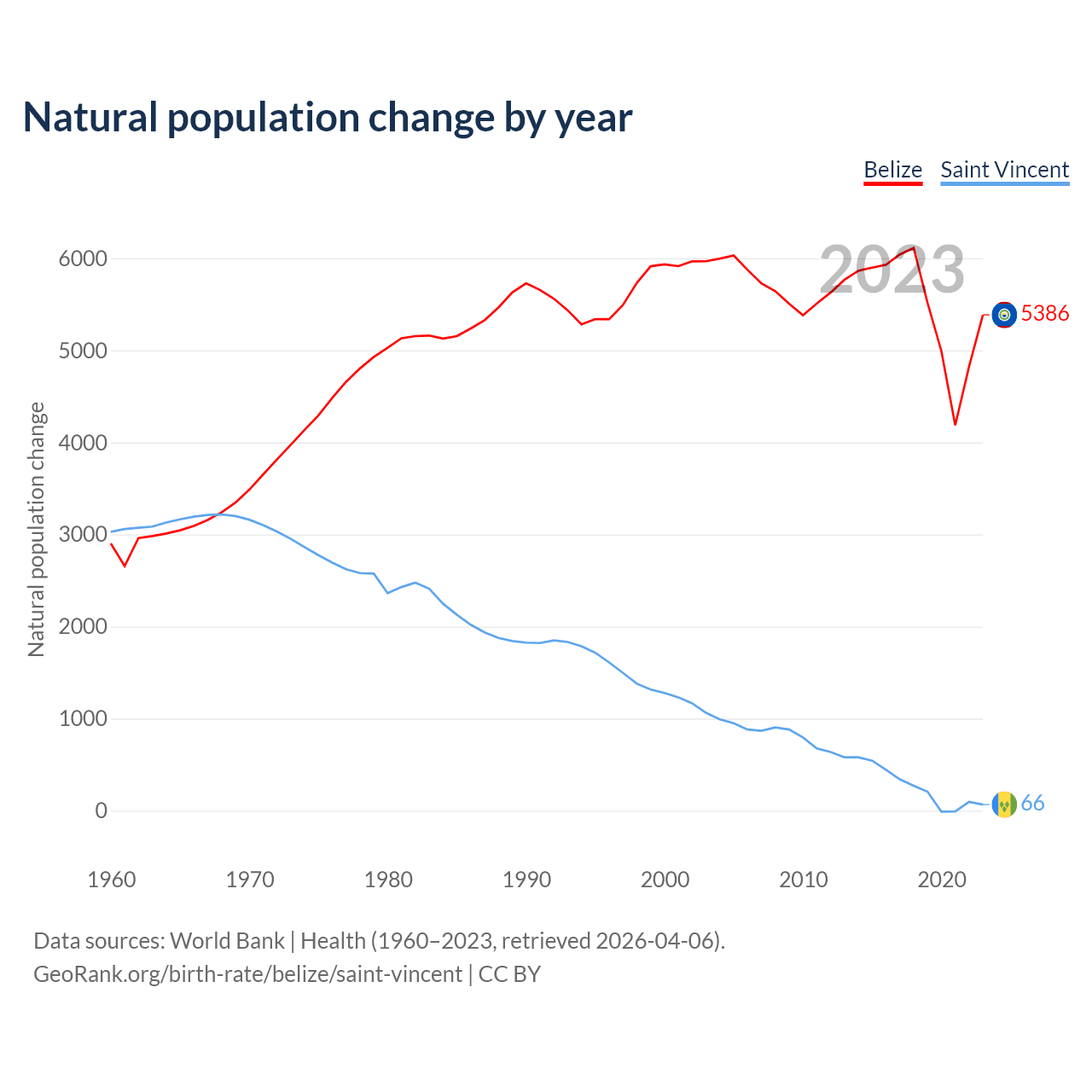 According to the latest available data on birth rates, the fertility rate in Belize was 2.01 children per woman in 2023, compared to 1.78 in Saint Vincent in 2023. The replacement level is considered to be 2.1 children per woman.