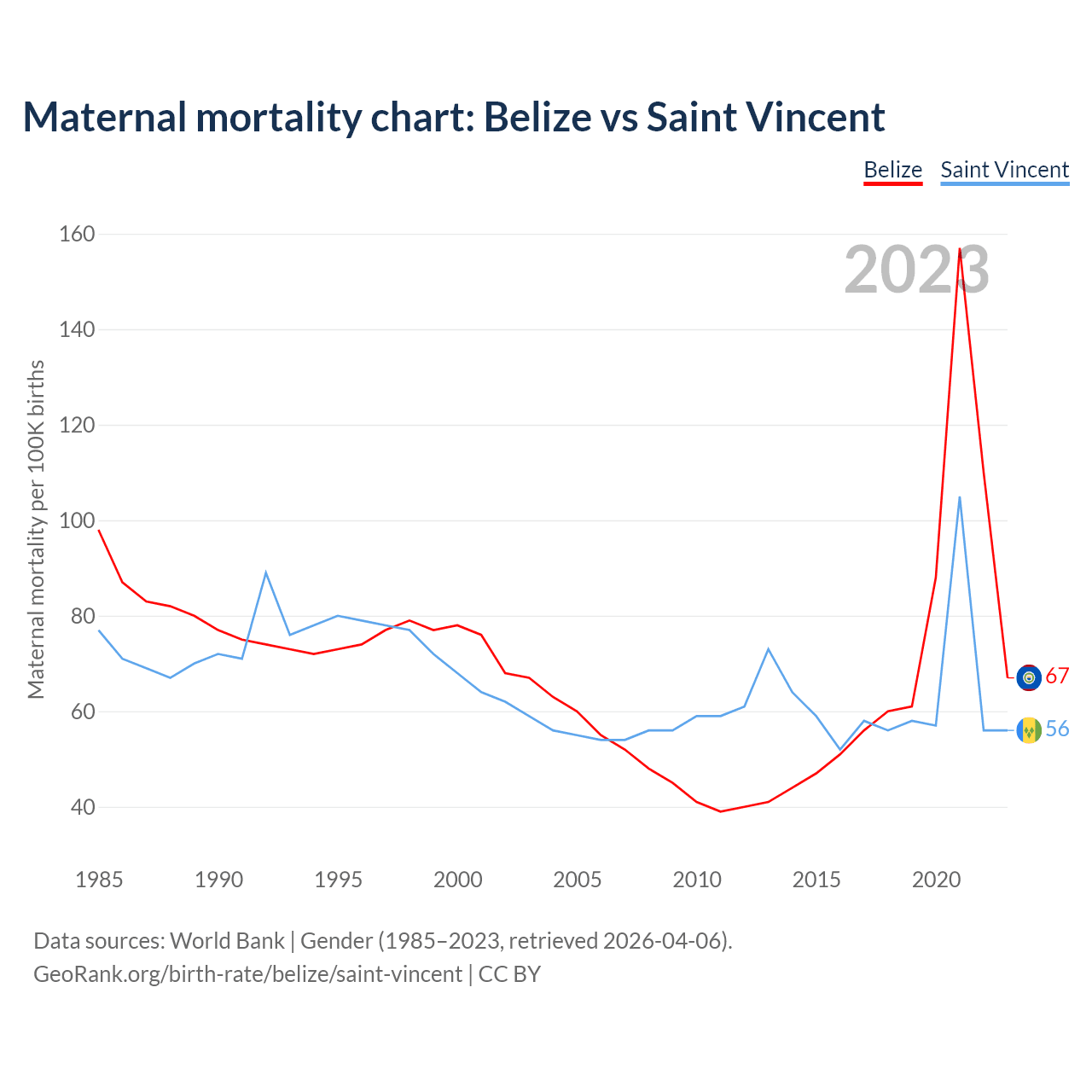 The maternal mortality rate, which is the probability of dying during childbirth or within 42 days of pregnancy termination, is 67 deaths per 100,000 live births in Belize, compared to 56 deaths in Saint Vincent.