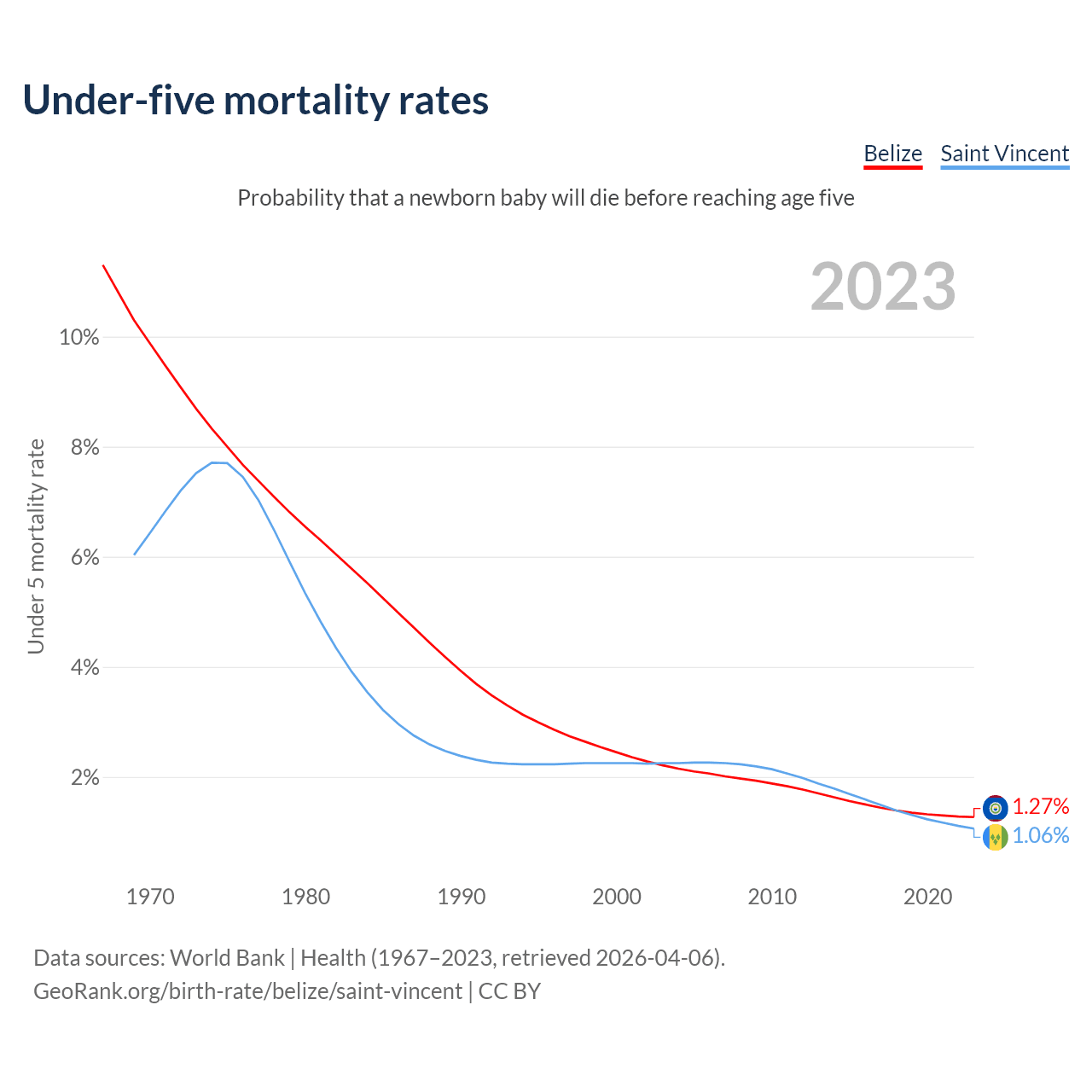 The chance that a newborn baby will die before reaching age five is 1.27% in Belize and 1.06% in Saint Vincent. Above is a chart with historical data on under-five mortality rates.