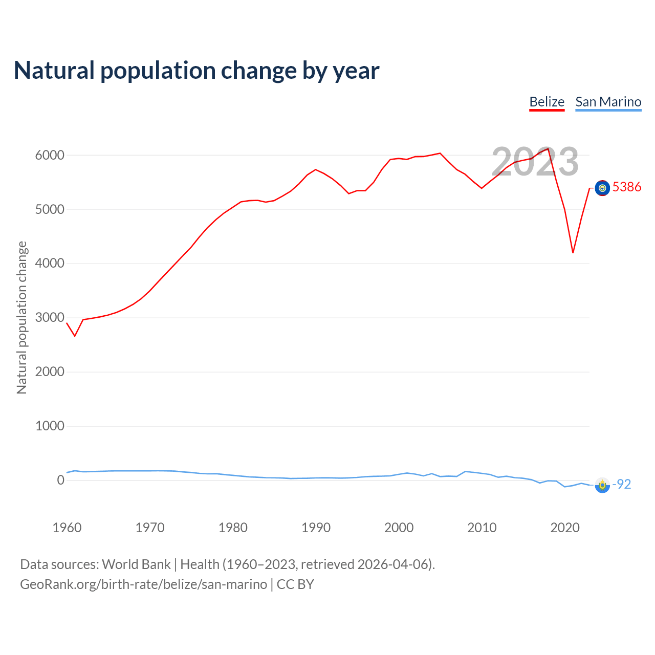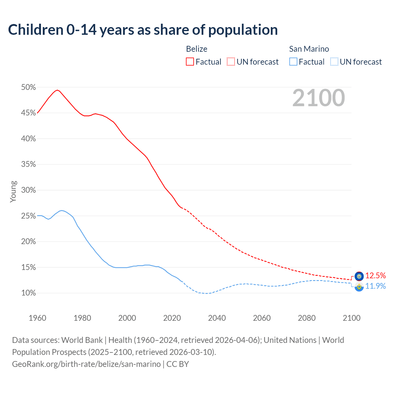 According to the latest available data on birth rates, the fertility rate in Belize was 2.01 children per woman in 2023, compared to 1.15 in San Marino in 2023. The replacement level is considered to be 2.1 children per woman.