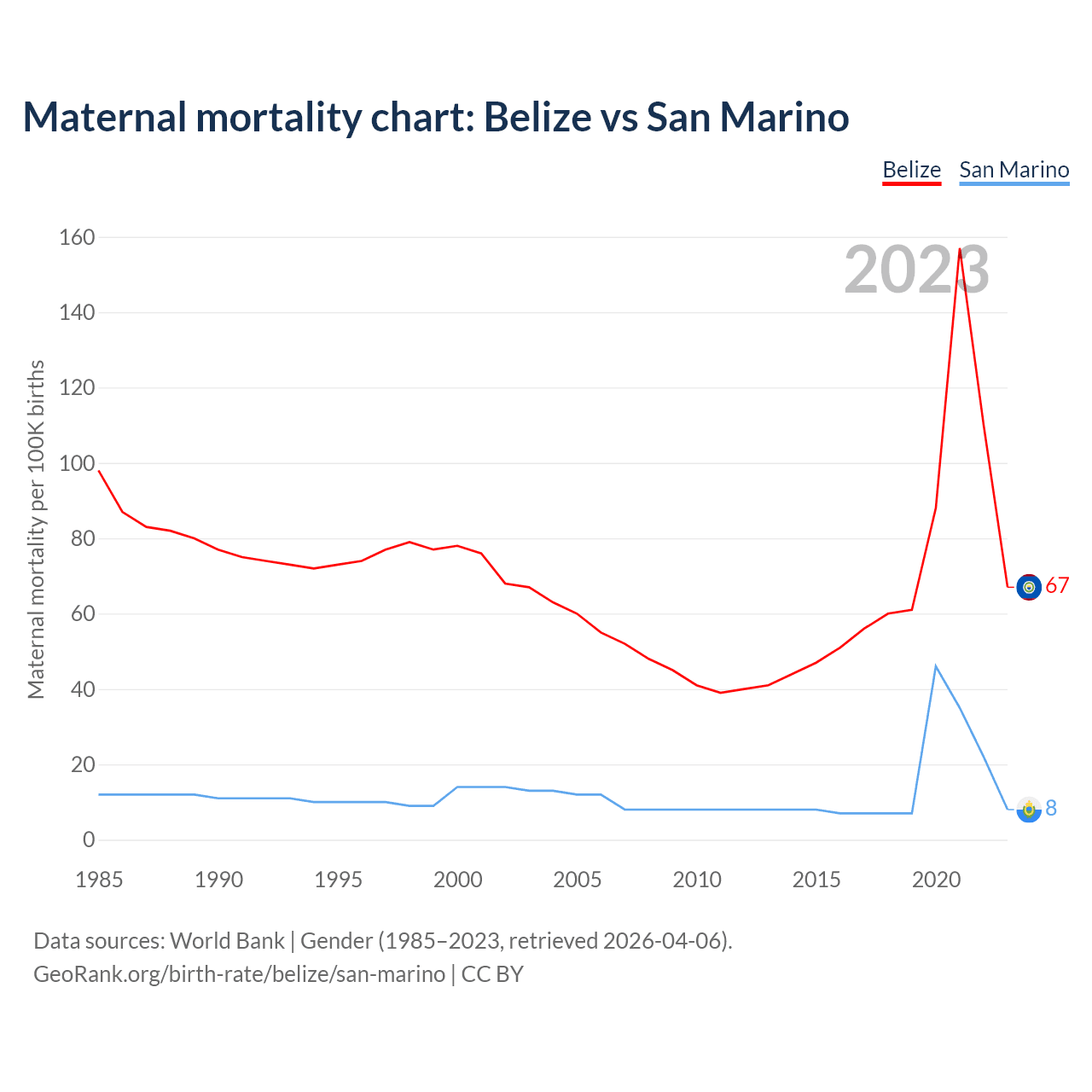 The maternal mortality rate, which is the probability of dying during childbirth or within 42 days of pregnancy termination, is 67 deaths per 100,000 live births in Belize, compared to 8 deaths in San Marino.