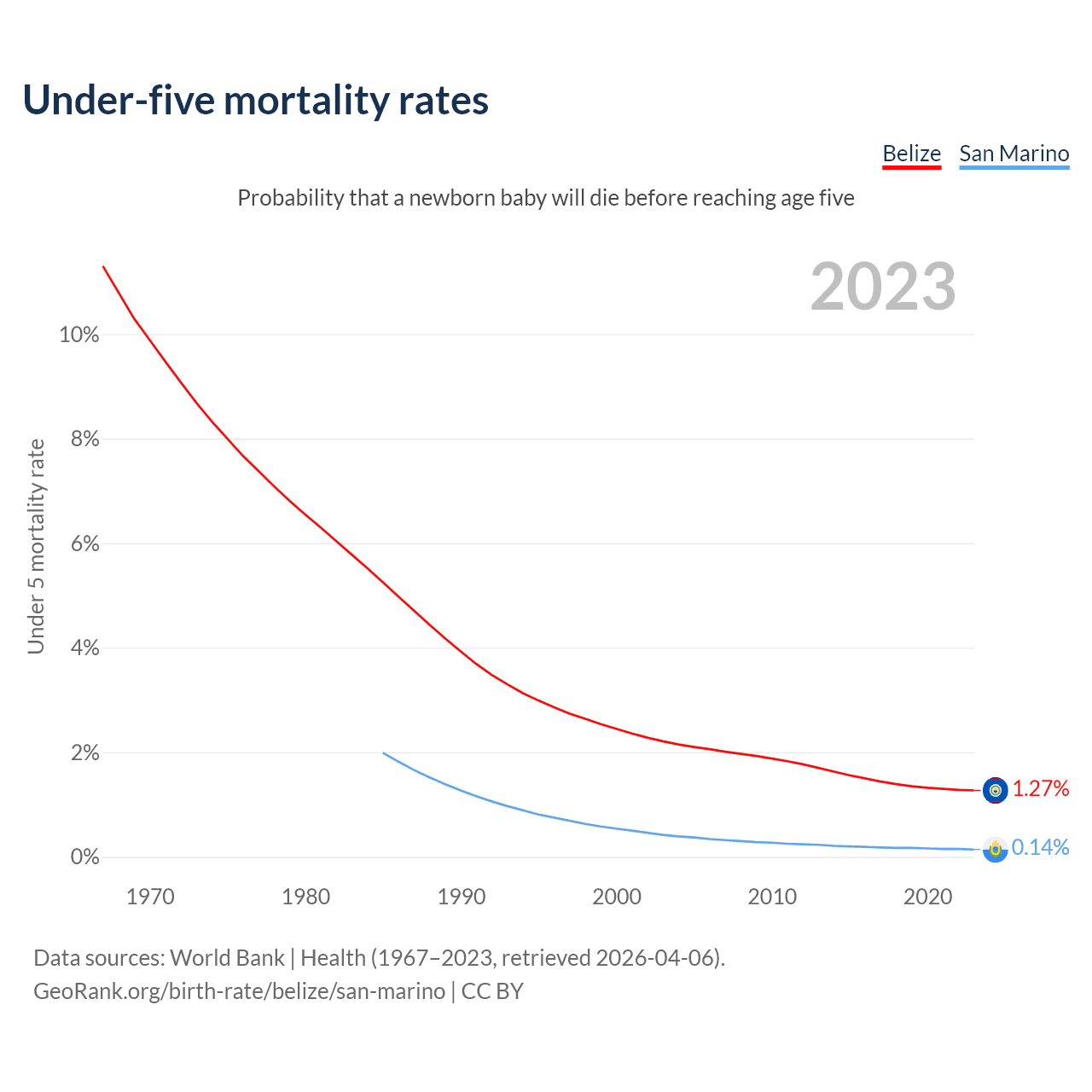 The chance that a newborn baby will die before reaching age five is 1.27% in Belize and 0.14% in San Marino. Above is a chart with historical data on under-five mortality rates.