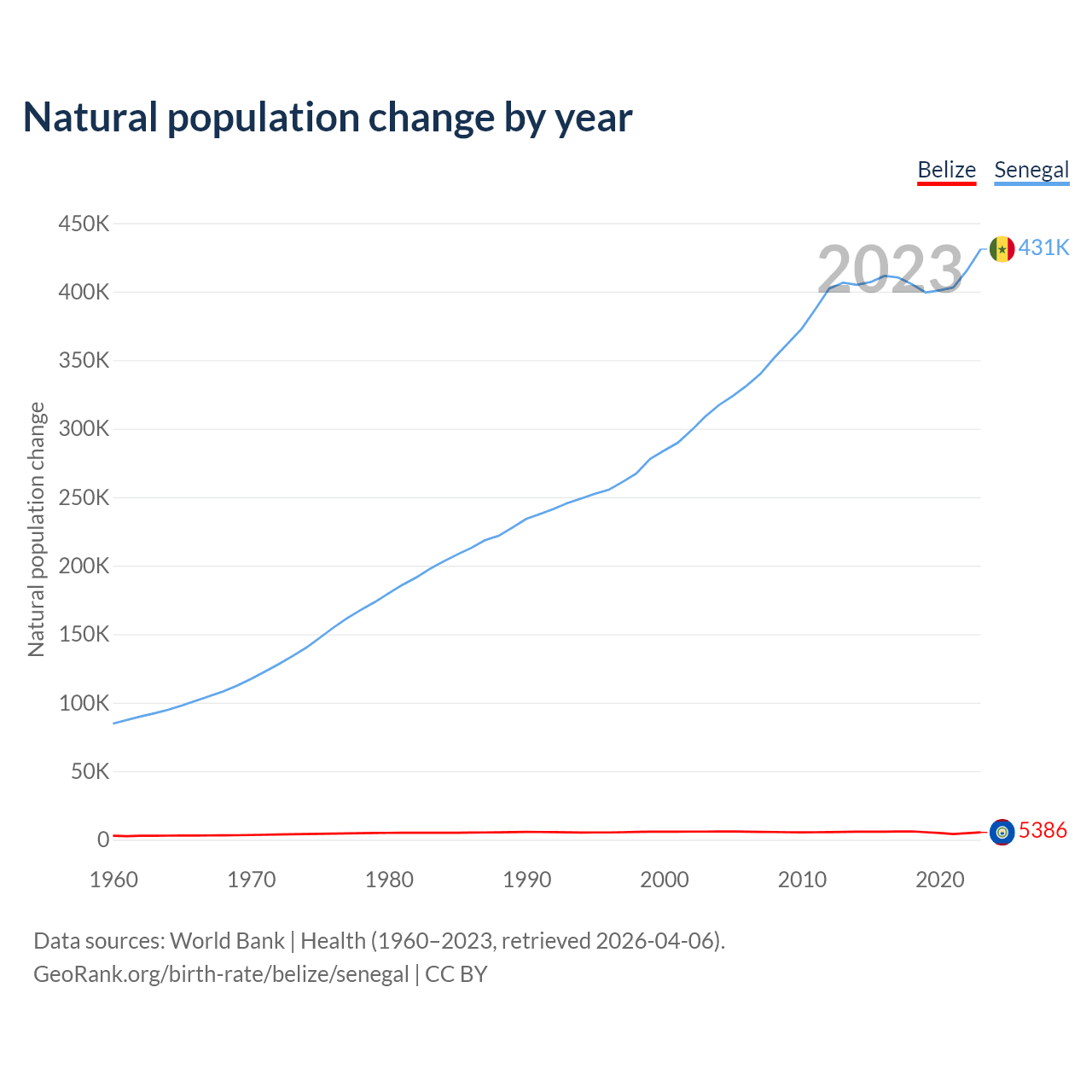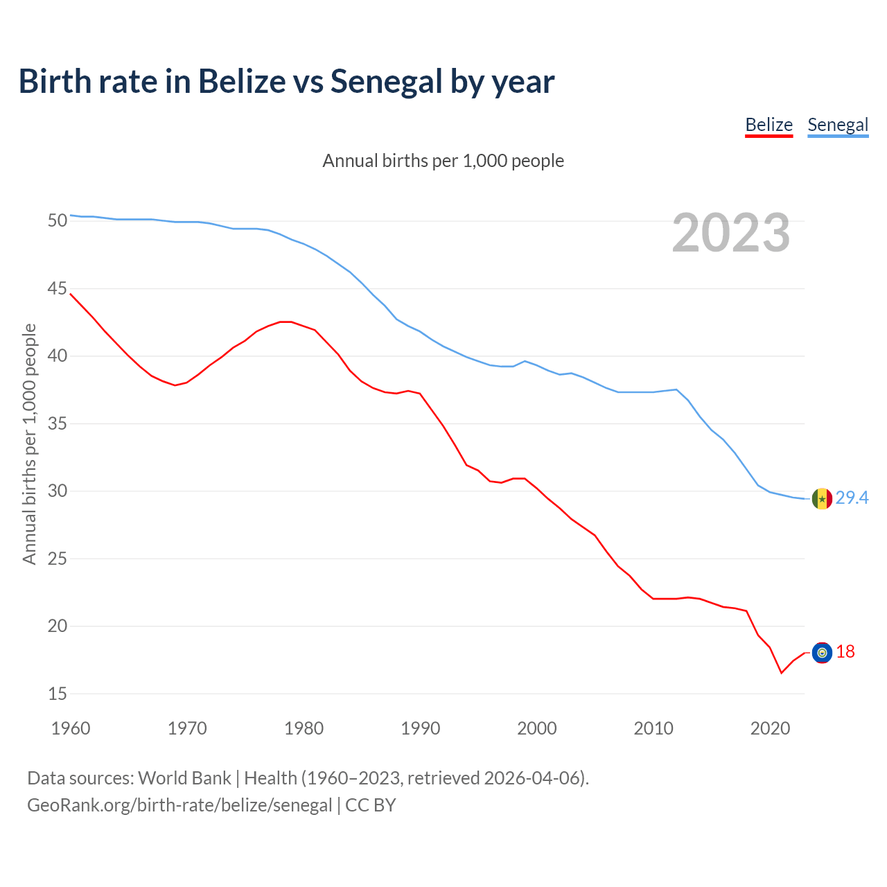 Belize has an annual birth rate of 18 births per 1,000 people, compared to 29.4 for Senegal. The average number of children a woman is expected to have during her lifetime — the fertility rate, is 2.01 in Belize and 3.82 in Senegal — 90.2% difference.