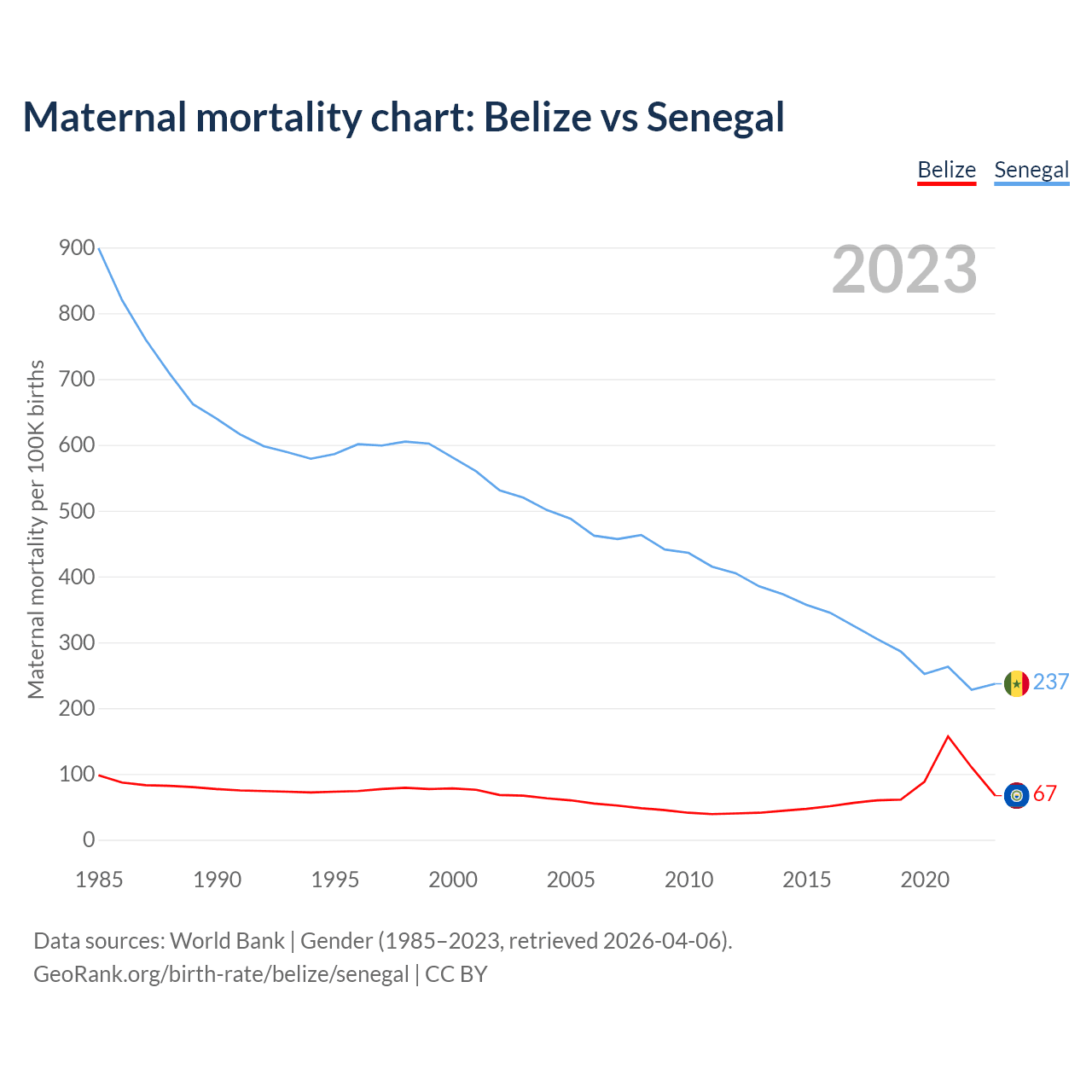 The maternal mortality rate, which is the probability of dying during childbirth or within 42 days of pregnancy termination, is 67 deaths per 100,000 live births in Belize, compared to 237 deaths in Senegal.