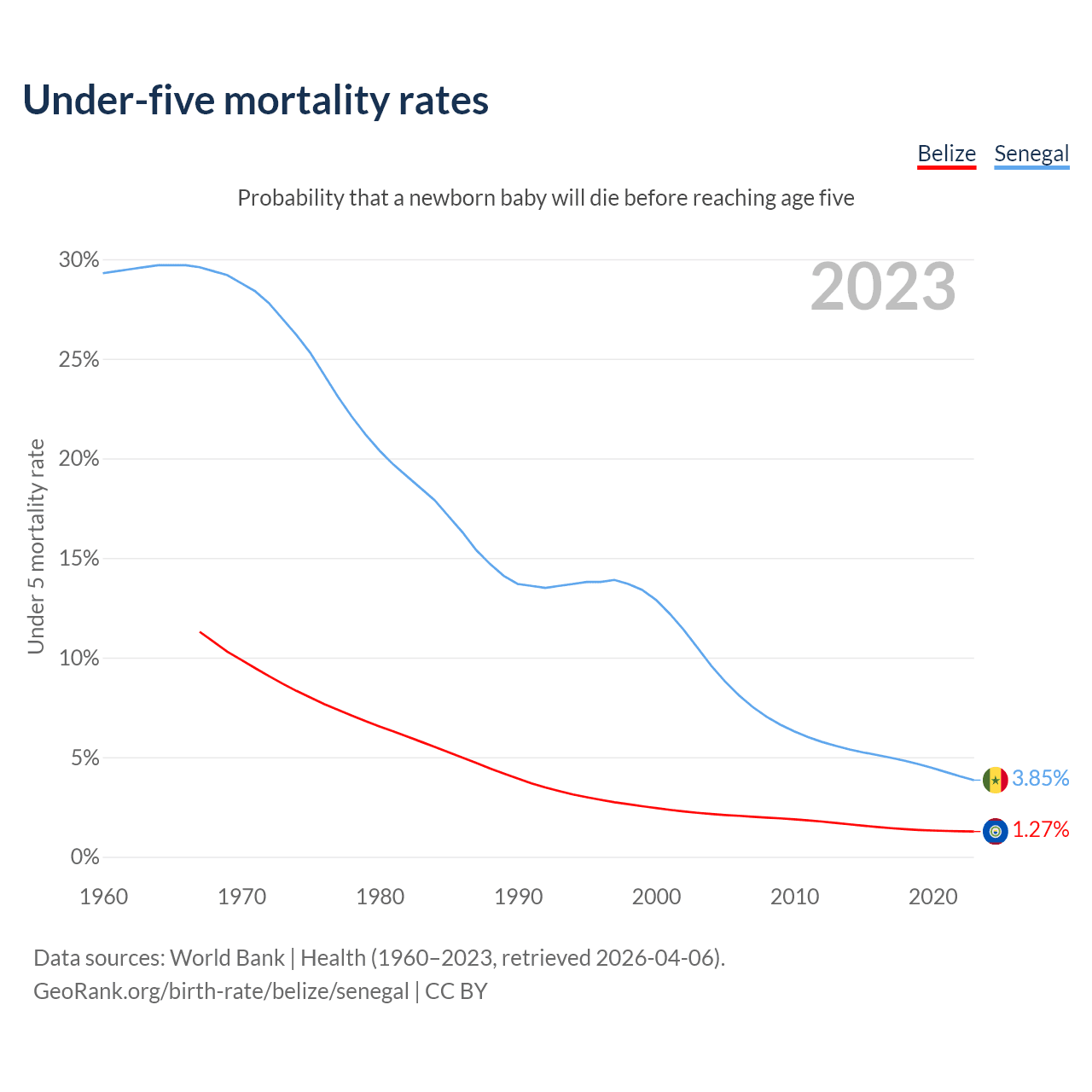 The chance that a newborn baby will die before reaching age five is 1.27% in Belize and 3.85% in Senegal. Above is a chart with historical data on under-five mortality rates.